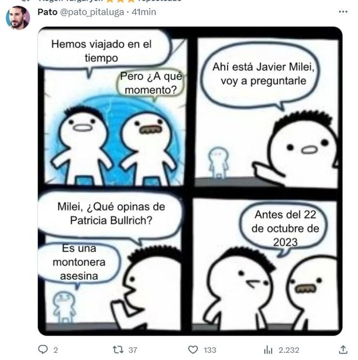 A medida que se anunciaban los resultados de más del 70% de las mesas escrutadas, que confirmaron un balotaje entre Sergio Massa, quien obtuvo el primer lugar, y Javier Milei en el segundo puesto, la creatividad de los internautas se disparó. Patricia Bullrich ocupó el tercer lugar en los resultados. Fue inmediato el estruendo de memes en las redes sociales, las que se vieron plagadas de fotografías, videos y gifs de todo tipo.