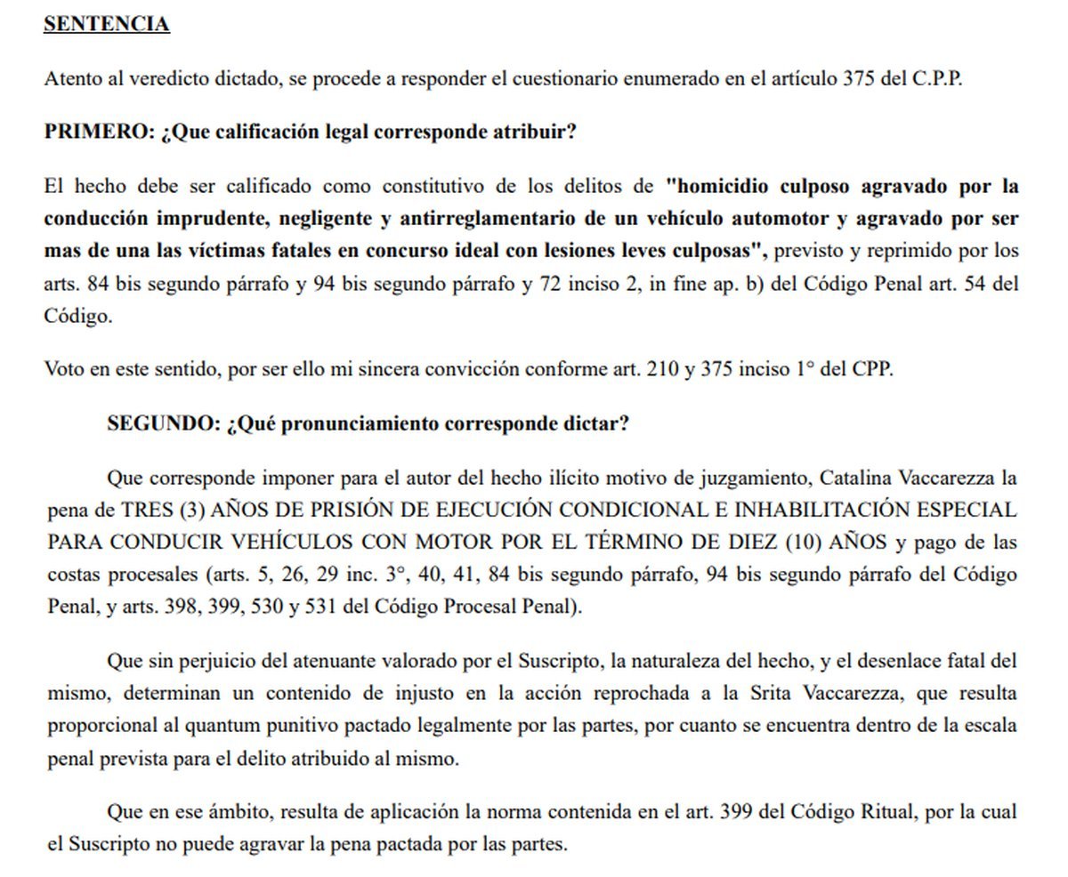 Catalina Vaccarezza, la joven que conducía el Peugeot 208, acordó recibir una pena de tres años de prisión condicional más otros 10 de inhabilitación para manejar en toda la República Argentina, por lo que no irá a la cárcel pese a ser condenada.