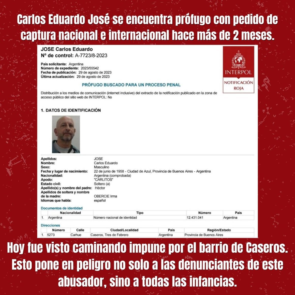 Es por eso que la cuenta le pidió a todos los vecinos de la zona que estén atentos a su posible presencia, ya que tiene un pedido de captura tanto en la República Argentina como en otros 195 países.