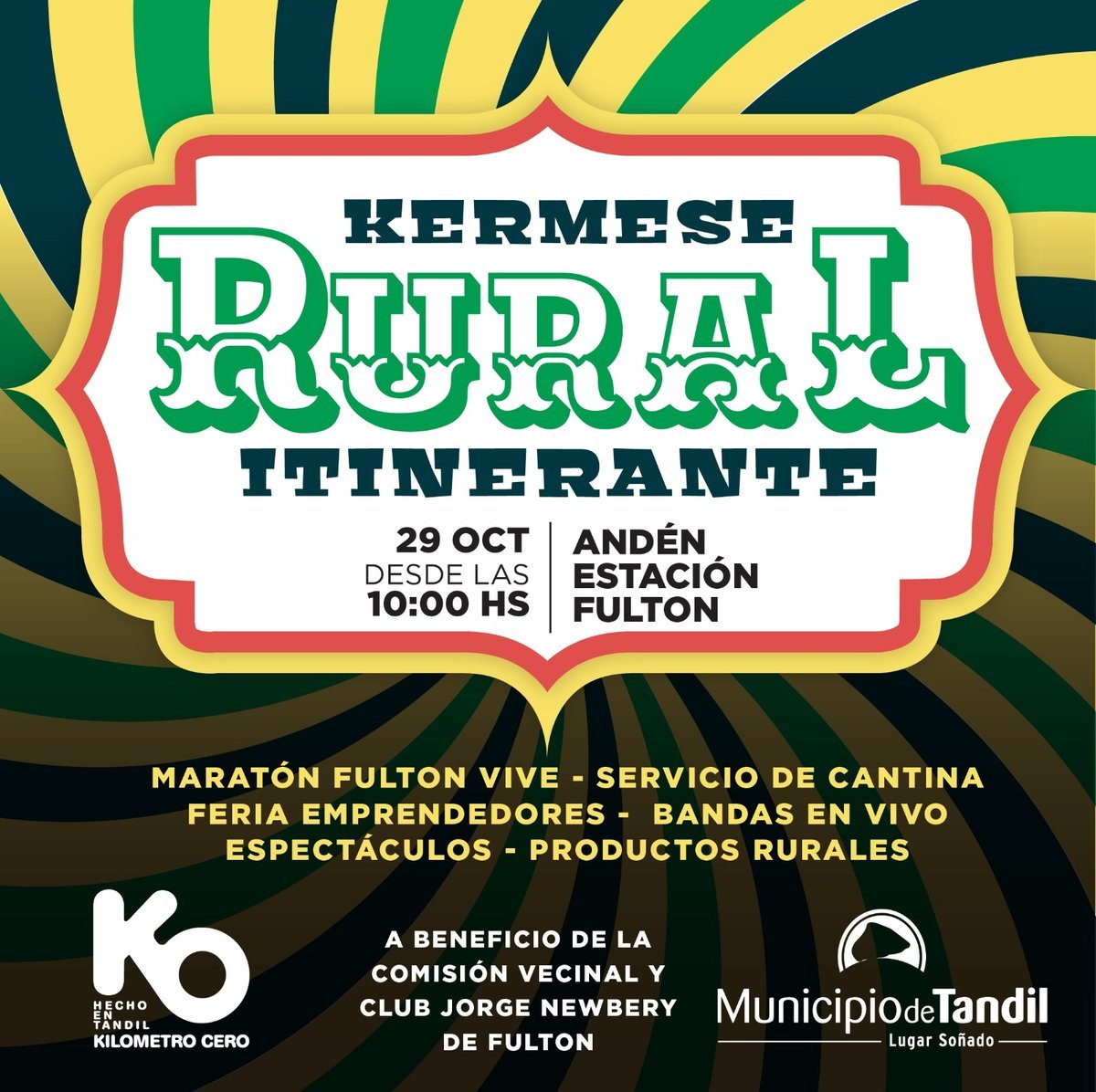 Este domingo 29 de octubre, la localidad bonaerense de Fulton recibirá la primera edición de la Kermese Rural Itinerante solidaria, con stands de emprendedores, cantinas, shows artísticos y muchas sorpresas. El evento a beneficio de la Comisión Vecinal y el Club se llevarán a cabo a partir de las 10 horas, en el andén de la Estación Fultón, partido de Tandil.