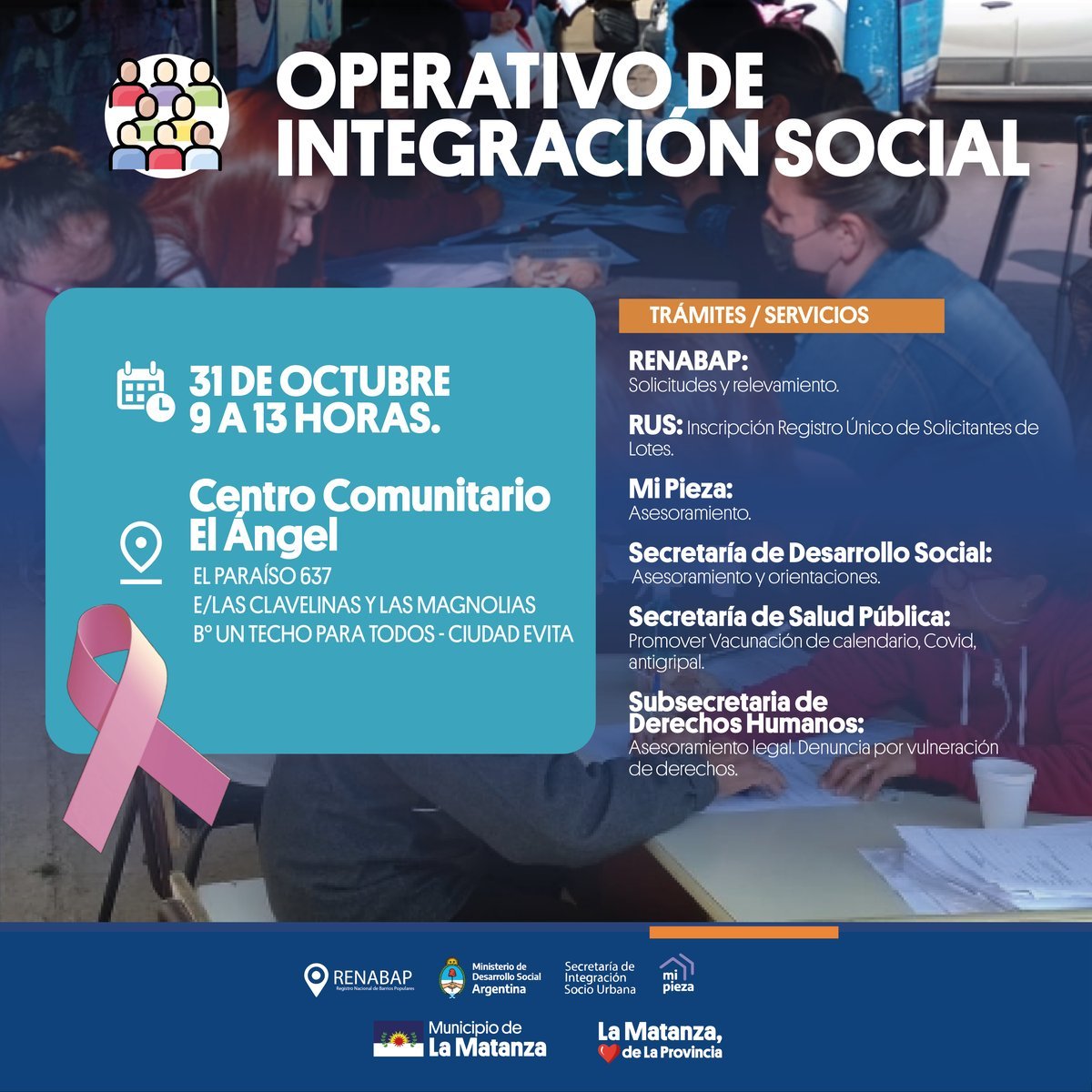 Solicitud y relevamiento por parte del Registro Nacional de Barrios Populares (RENABAP) e Inscripción Registro Único de Solicitantes de Lotes (RUS), asesoramiento sobre MI PIEZA, acceso a la salud (Promo-Ver y vacunación de calendario, COVID, antigripal), la Subsecretaría de Derechos Humanos de La Matanza brindará asesoramiento legal y denuncia por vulneración de derechos, e información y orientación desde la Secretaría de Desarrollo Social local.