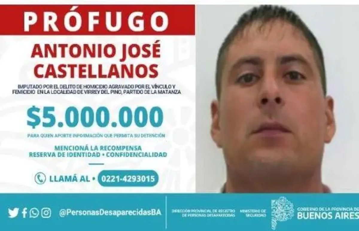 Se trata de Antonio José Castellanos, un hombre nacido hace cuatro décadas y domiciliado en la ciudad vecina de González Catán sobre quien pesa una millonaria recompensa de 5 millones de pesos ofrecida por el Ministerio de Seguridad de la Provincia de Buenos Aires para todo aquel que brinde información fehaciente que permita dar son su paradero.