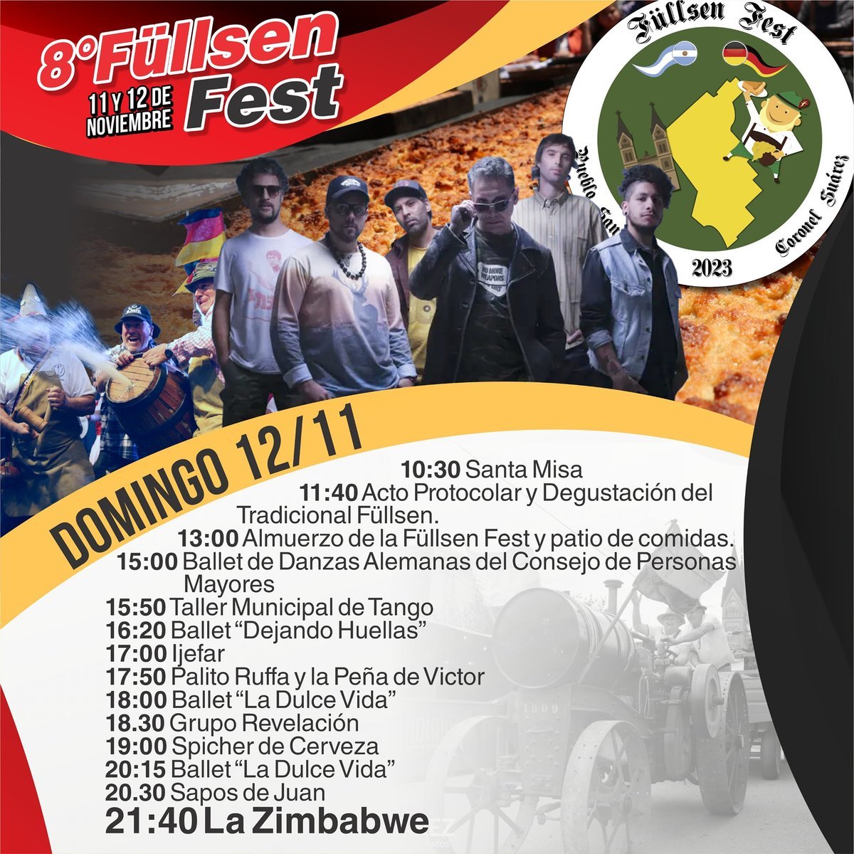 Mientras que el domingo 12, a partir de las 10.30 horas, tendrá lugar la Santa Misa. A las 11.40 horas, se realizará el acto protocolar y degustación del tradicional füllsen. A las 13 horas, se llevará adelante un almuerzo de la Füllsen Fest y patio de comidas. A las 15 horas, el taller municipal de Tango. A las 16.20 horas, se presentará el ballet "Dejando Huellas". A las 17 horas, Ijefar. A las 17.50 horas, será el turno de Palito Ruffa y la Peña de Víctor. A las 18 horas, se subirá al escenario el ballet "La Dulce Vida". A las 18.30 horas, Grupo Revelación. A las 19 horas, se realizará el spicher de cerveza. A las 20.15 horas, el ballet "La Dulce Vida". A las 20.30 horas, Sapos de Juan. A las 21.40 horas, el show del cierre de la jornada estará a cargo de La Zimbabwe.