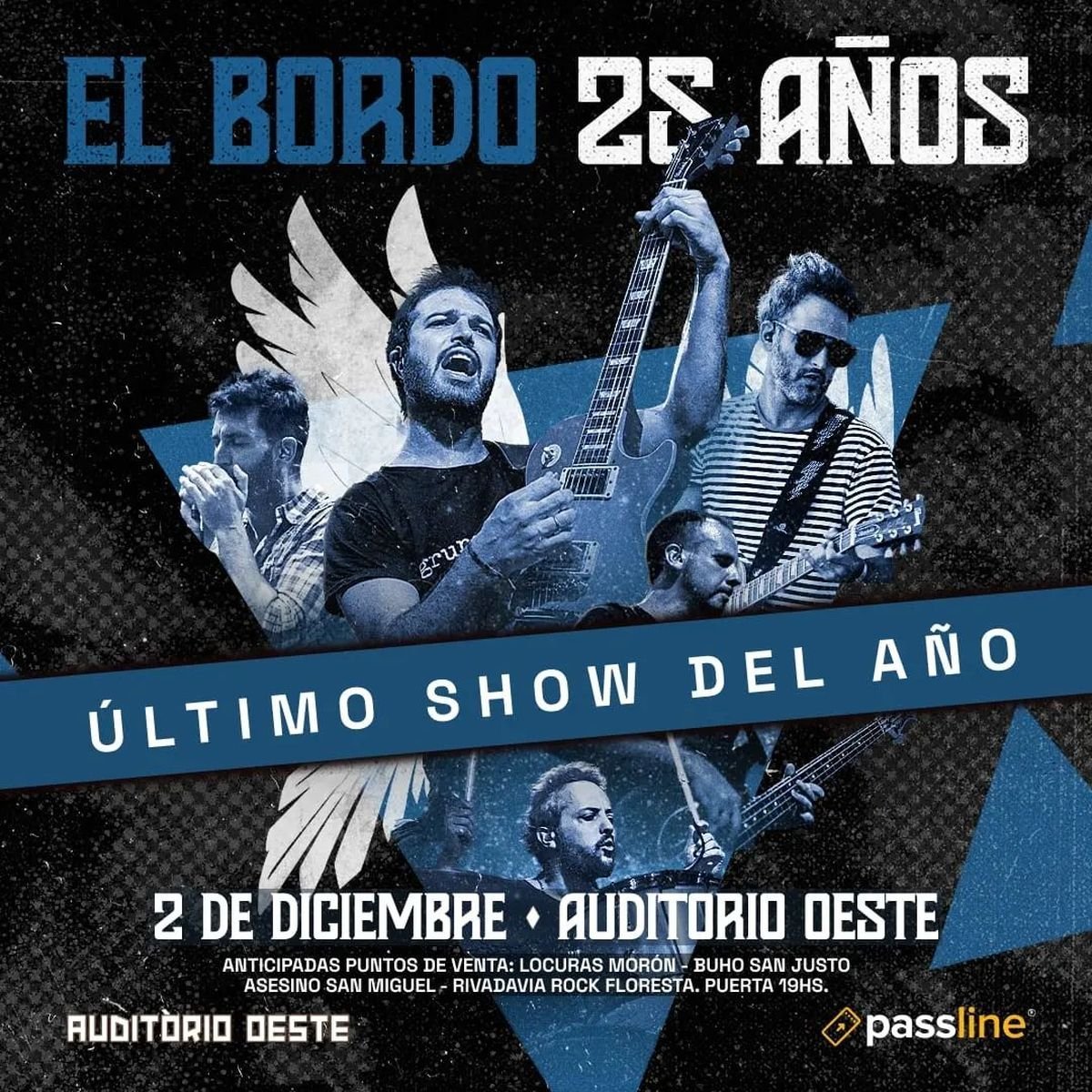 El Bordo cerrará el año con un gran show en la zona oeste del Gran Buenos Aires, celebrando sus 25 años de carrera. La cita será el sábado 2 de diciembre, a partir de las 19 horas, en el Auditorio Oeste ubicado en la Avenida Rivadavia 17320, en la localidad de Haedo, partido de Morón.