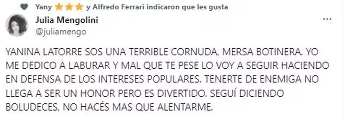 "Yanina Latorre sos una terrible cornuda, mersa botinera. Yo me dedico a laburar y mal que te pese lo voy a seguir haciendo en defensa de los intereses populares. Tenerte de enemiga no llega a ser un honor pero es divertido. Seguí diciendo boludeces, no hacés más que alentarme", sentenció Mengolini.