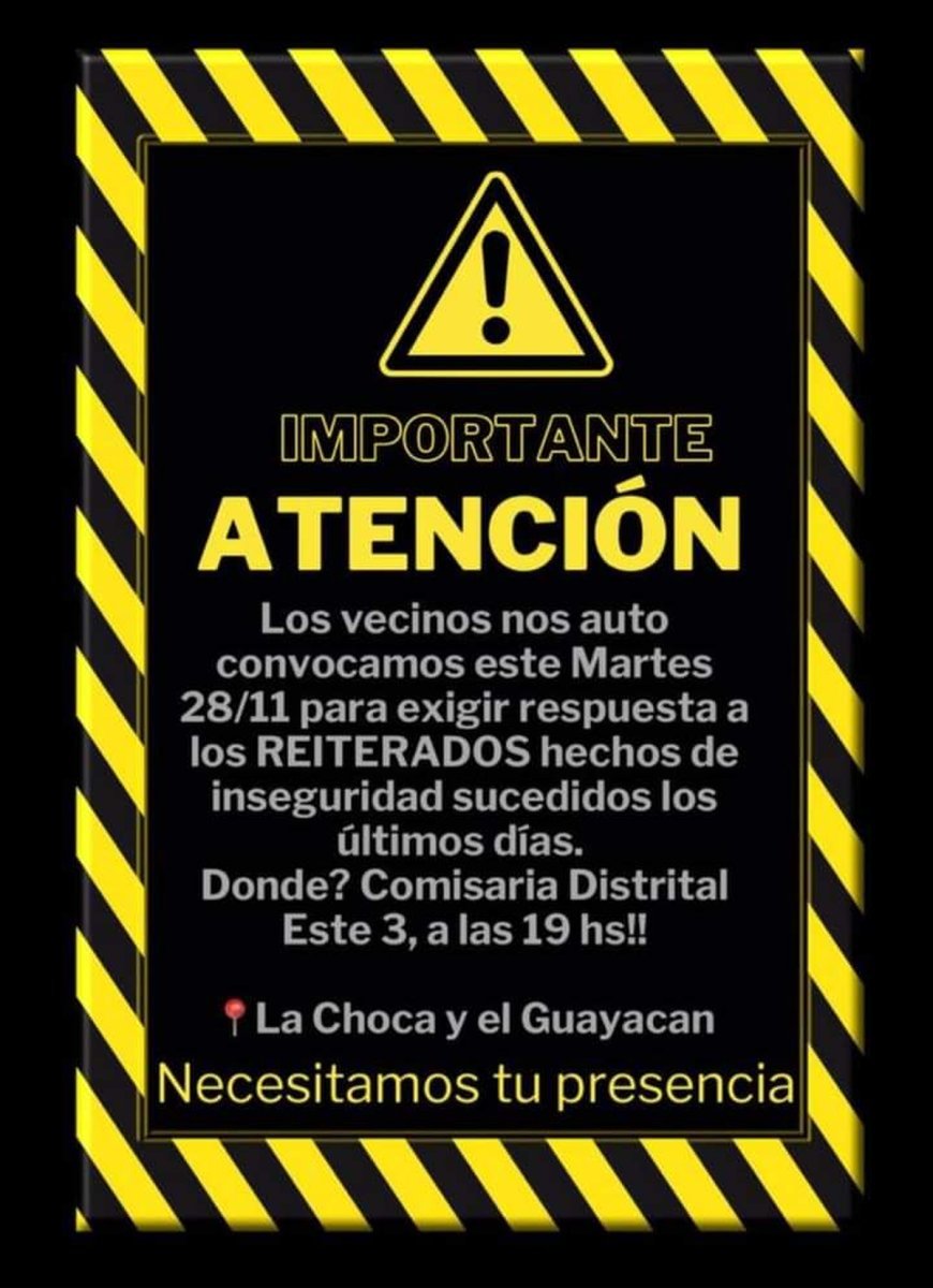Ante esta situación y después de reiterados hechos similares, los vecinos de la ciudad se autoconvocaron para marchar a la Comisaría Este Tercera en reclamo de más seguridad y para exigir respuestas ante la ola de robos y entraderas que se registraron en los últimos días, de acuerdo a lo expresado en el flyer.