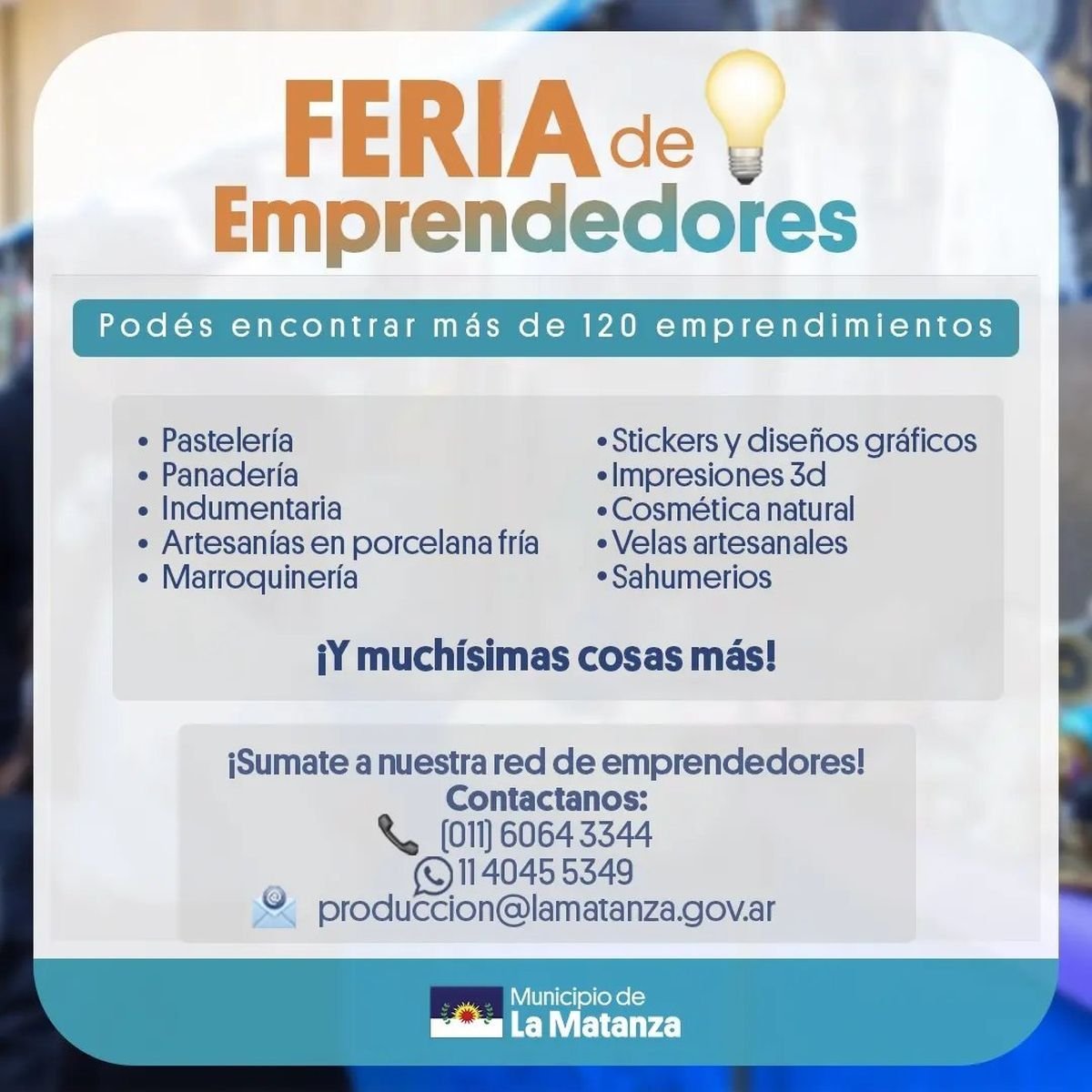 Quienes deseen formar parte de la Red de Emprendedores de La Matanza pueden comunicarse al 011 6064-3344 / 11 4045-5349 o bien escribir a [email protected], allí serán asesorados para comenzar a ser parte de las ferias.