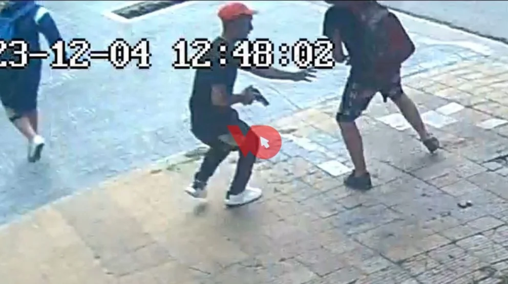 Las imágenes muestran como el delincuente venía en un Volkswagen Fox de color azul opaco, se baja y se coloca una gorra roja para perpetuar el asalto contra un grupo de cuatro estudiantes que volvían a sus casas después de finalizar su jornada del turno mañana.