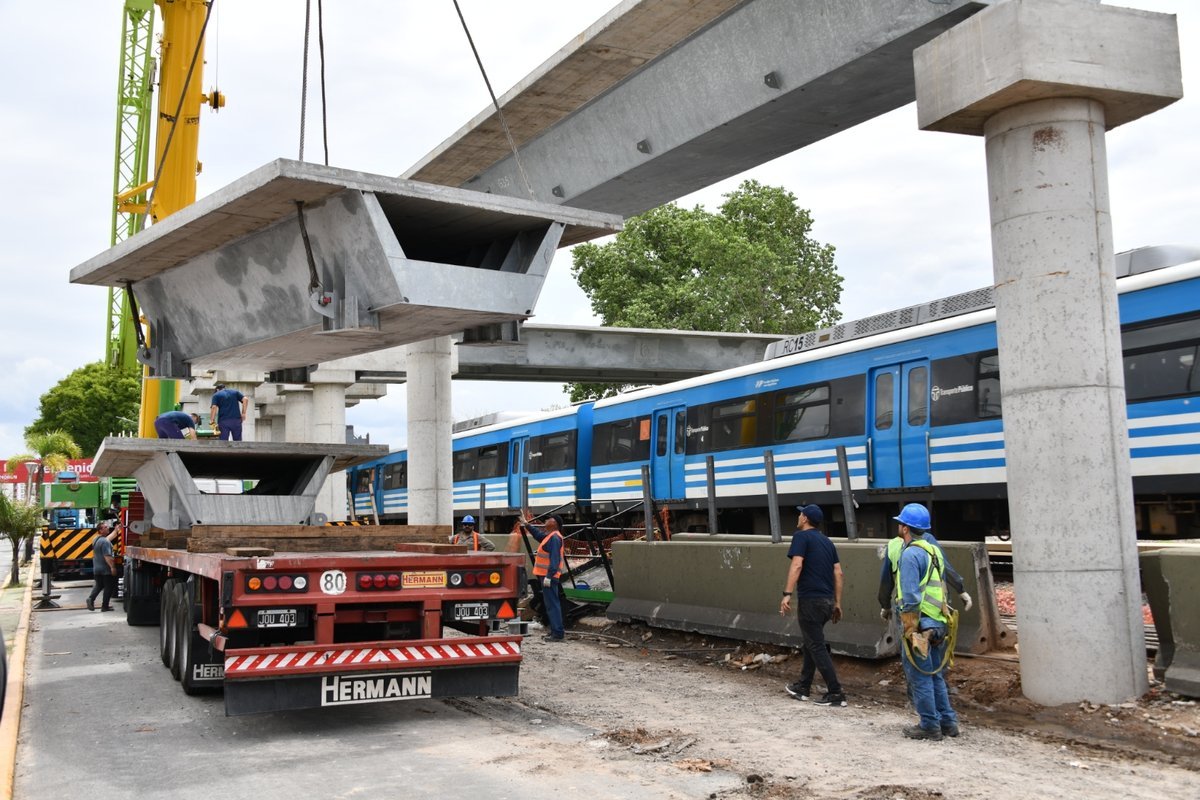 Montaje de la pista central de uno de los puentes modulares sobre el Tren Sarmiento en Haedo.