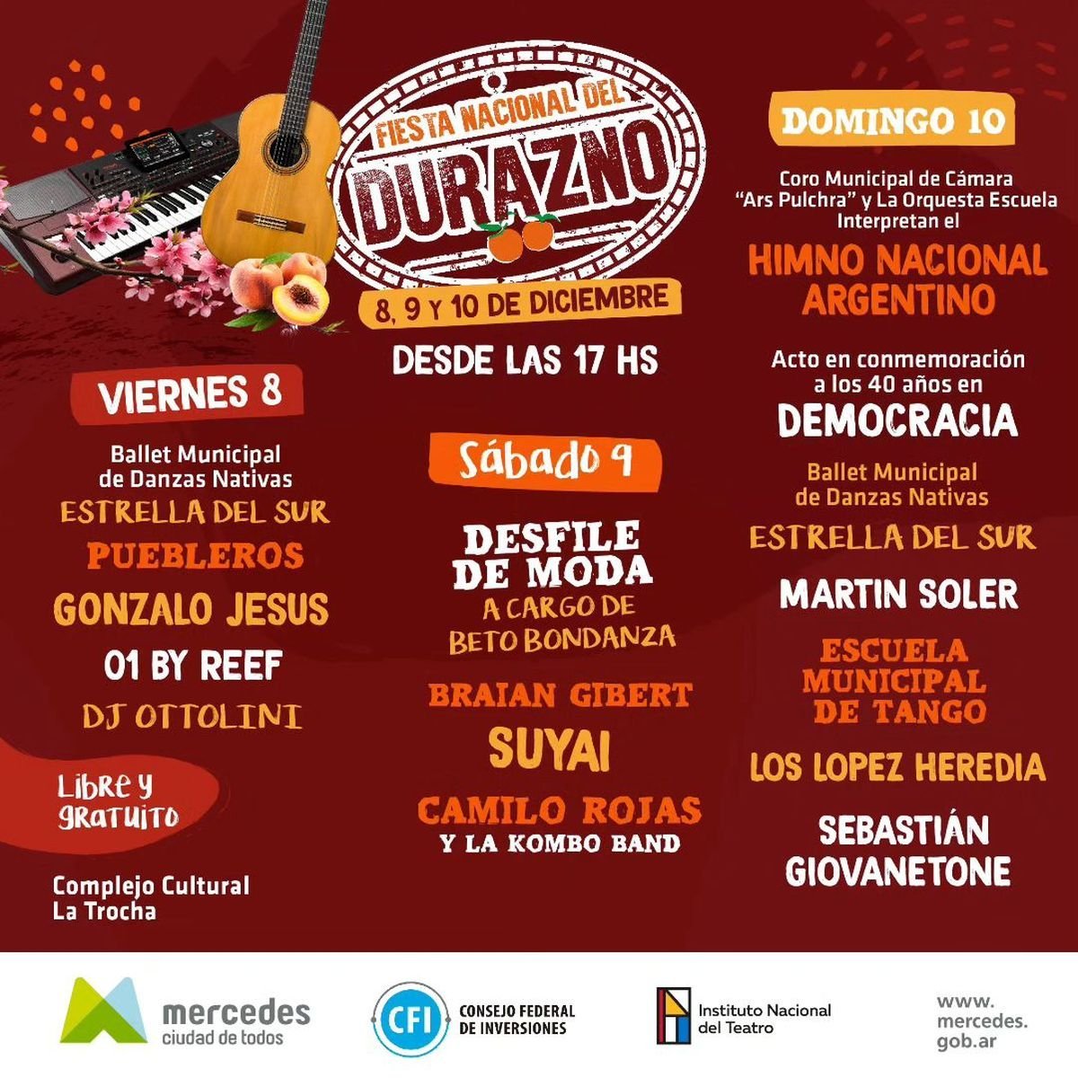 Del viernes 8 al domingo 10, en Mercedes, se llevará a cabo la 47° edición de la Fiesta Nacional del Durazno, una propuesta ideal para disfrutar del fin de semana largo al aire libre y con actividades pensadas para toda la familia, con entrada libre y gratuita, shows en vivo, patio gastronómico y cervecero, y mucho más.