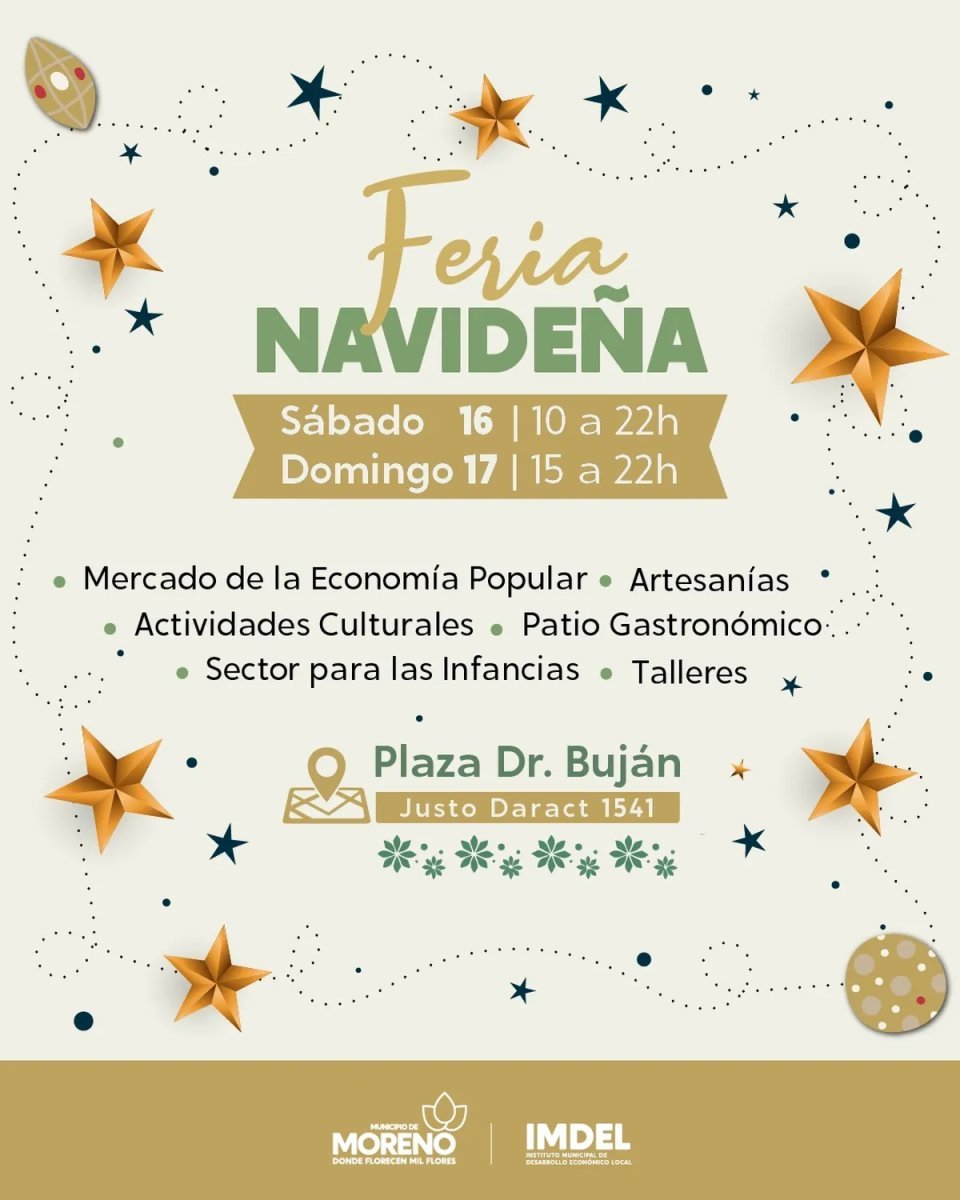 Este fin de semana, a través del IMDEL (Instituto Municipal de Desarrollo Económico Local) se realizará una feria navideña para que los vecinos puedan elegir sus regalos de fin de año de la mano de emprendedores del partido. La actividad se llevará a cabo durante el sábado 16 de 10:00 a 20:00 horas, y el domingo 17 de diciembre de 15:00 a 22:00 horas en la Plaza Buján (Justo Daract 1541, Paso del Rey).