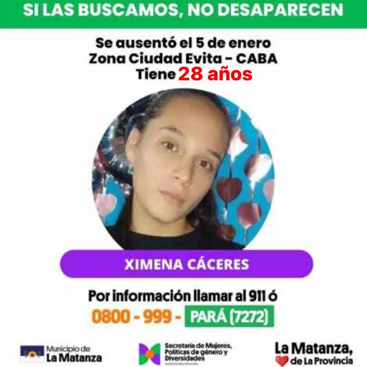 Ximena Cáceres salió de su hogar ubicado en Ciudad Evita porque tenía turno para realizarse un estudio médico, pero al notar que no regresaba su pareja decidió hacer la denuncia donde indicó que la joven se fue del domicilio sin celular y sin dinero en efectivo, solo con su tarjeta SUBE y el DNI.