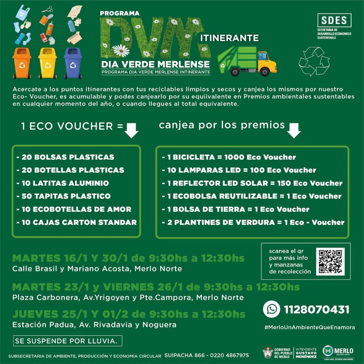 La Secretaría de Desarrollo Económico Sustentable del Municipio de Merlo anunció que este viernes, 12 de enero, lanzó de manera oficial su nuevo programa "Día Verde Merlense Itinerante", el cual va a estar vigente por todo el corriente mes y busca fomentar el cuidado del medio ambiente a través de una serie de beneficios.
