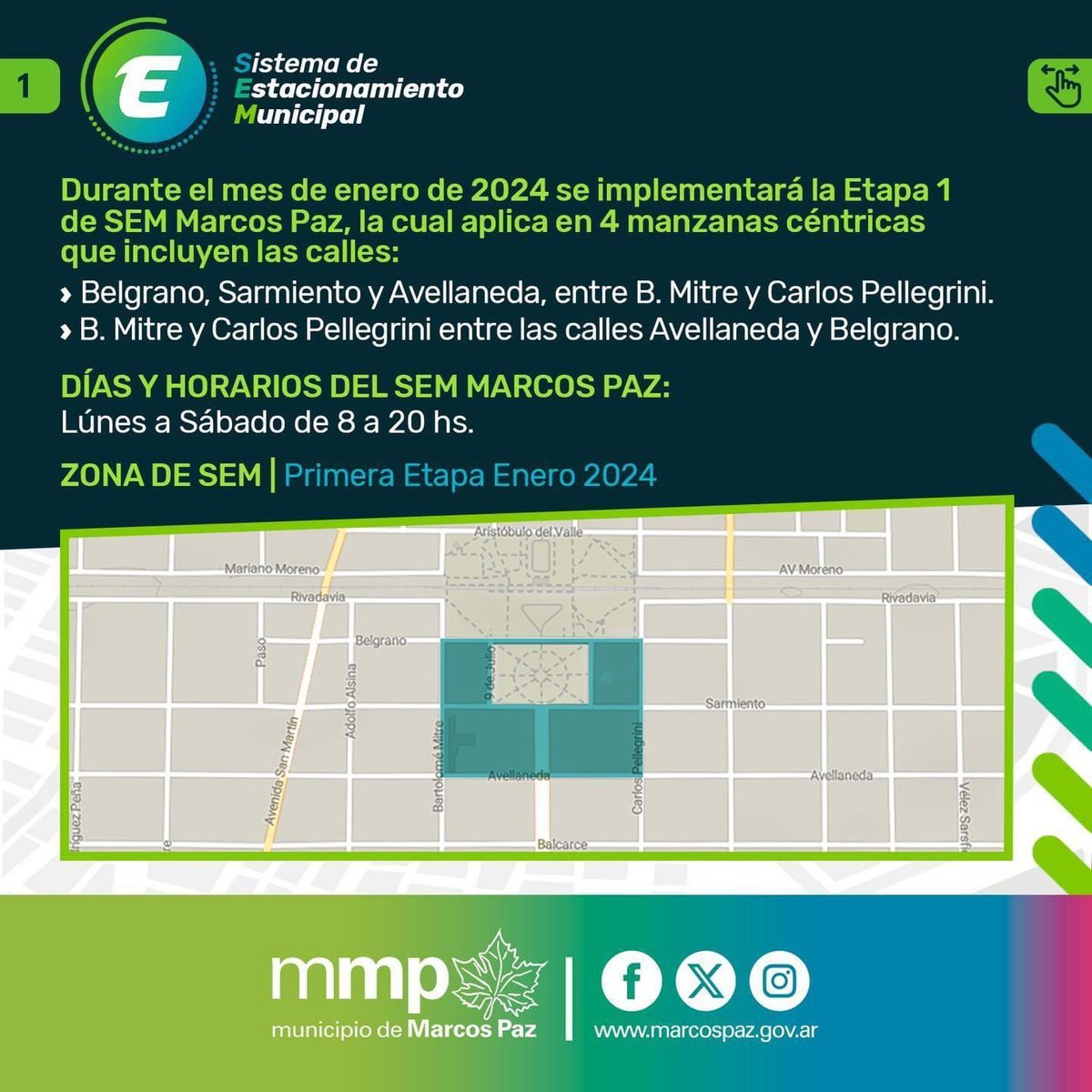 El Municipio de Marcos Paz puso en marcha una campaña de difusión y concientización sobre la implementación del nuevo Sistema de Estacionamiento Municipal, el cual comenzará a regir a partir del 1° de febrero, bajo la Ordenanza 42/2022. Se trata de un sistema que es parte del Plan de Movilidad Sustentable y tiene como objetivo ordenar el tránsito y la re circulación de vehículos en zonas céntricas.