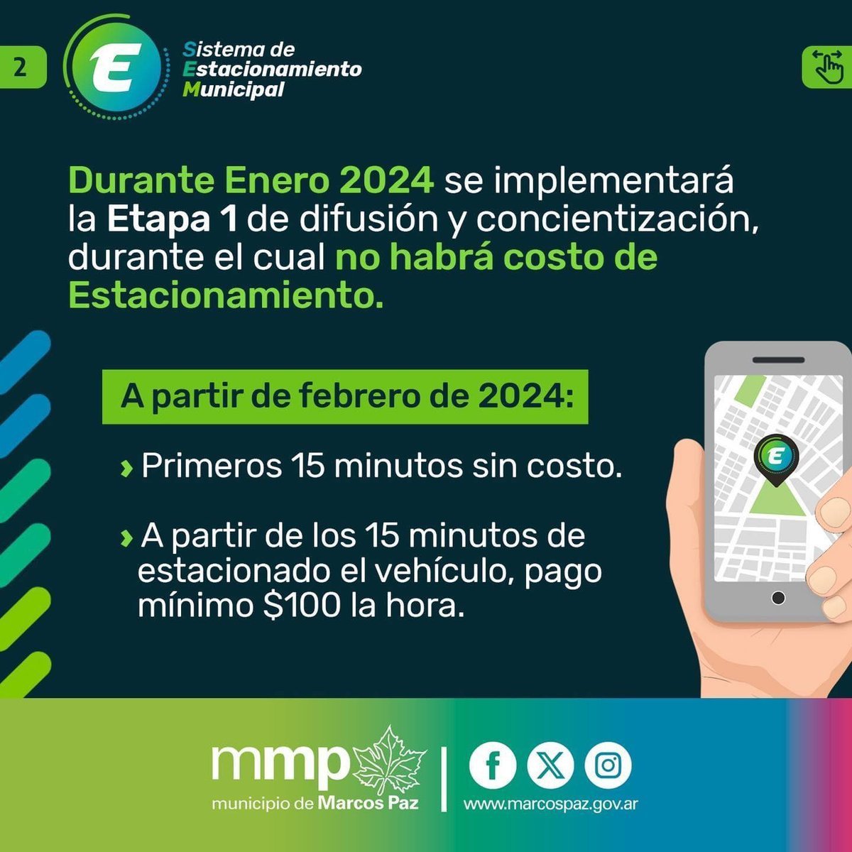 "A partir del 1° de febrero se hará efectiva la aplicación de este sistema, que funcionará de lunes a sábados, de 8 a 20 horas, con un costo de $100 la hora y comenzando a pagar el estacionamiento luego de '15 minutos de gracia'", explicó Gisela Cahue, integrante de la subsecretaría de Control y Gestión de Marcos Paz.