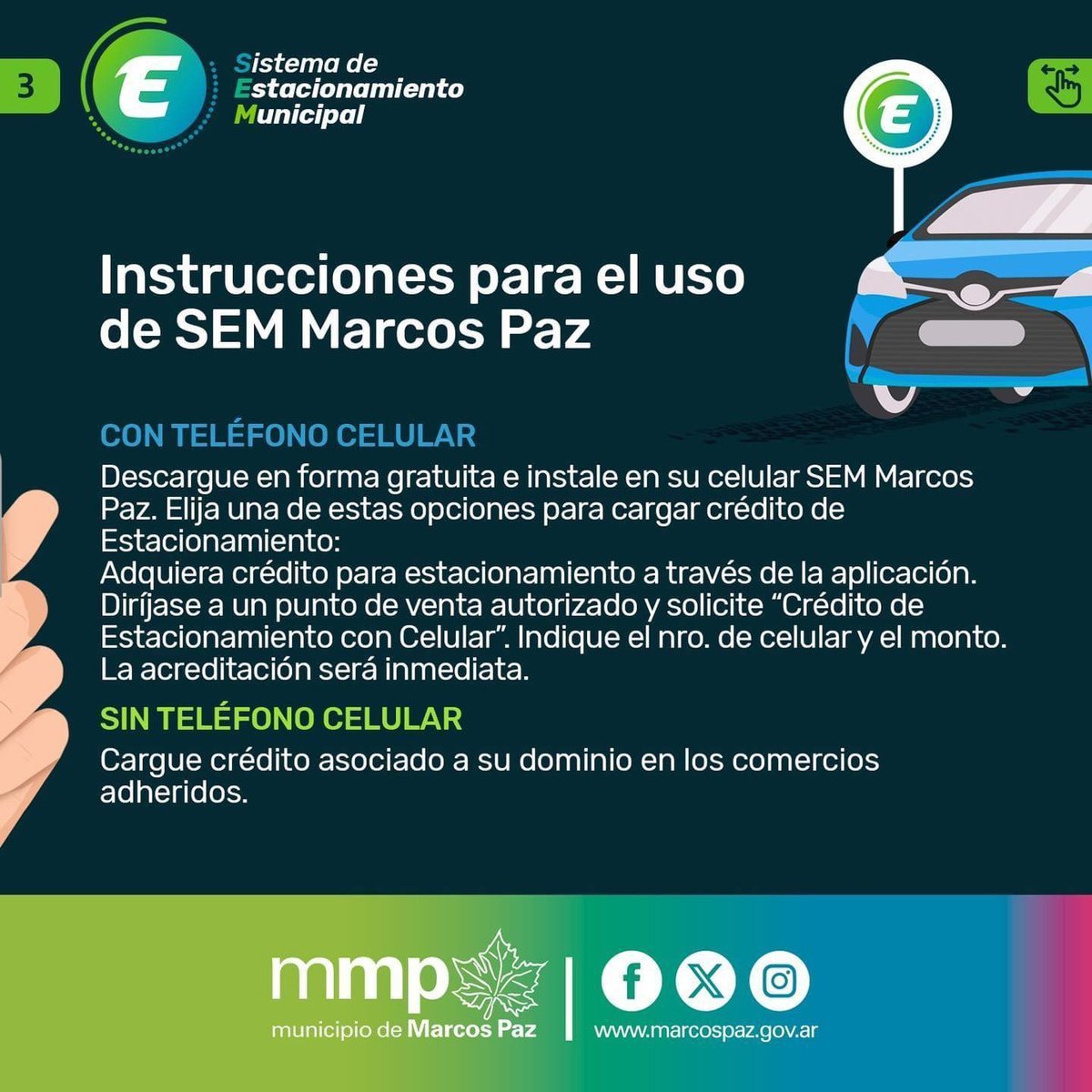 Por su parte, Ricardo Barroca, responsable del operativo, señaló que "los vecinos deberán bajar la aplicación SEM Marcos Paz y seguir una serie de pasos que vincularán ese teléfono con una patente. De todas maneras, si no tiene la aplicación cargada deberá comprar la fracción de tiempo que solicite en alguno de los comercios adheridos".
