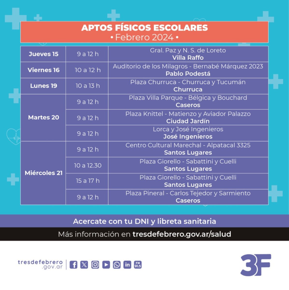 "Te acercamos las fechas para que traigas a los más chicos y se realicen los aptos físicos para el comienzo del ciclo escolar de este 2024", comunicaron desde el Municipio. Quienes estén interesados en adquirir el certificado, deberán acercarse a los diferentes puntos con el DNI original y la libreta sanitaria en mano.
