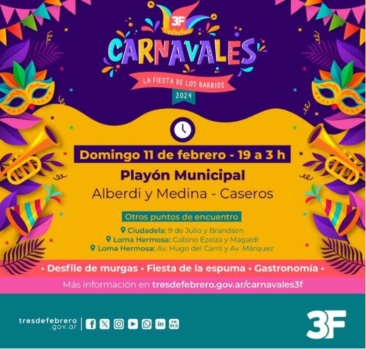 Este fin de semana, todas las familias podrán disfrutar de los carnavales 2024 a todo ritmo, diferentes actividades, patio gastronómico, fiesta de espuma, desfile de murgas y música en vivo en distintos puntos del partido bonaerense de Tres de Febrero.
