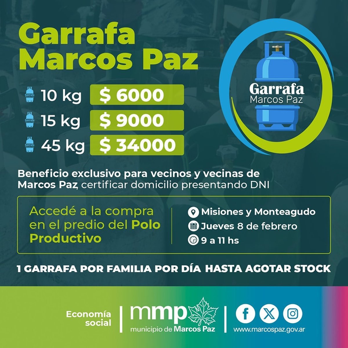 Nuevamente, el Municipio de Marcos Paz ofrecerá a un valor promocional el producto "Garrafa Marcos Paz" con el objetivo de que los vecinos del distrito puedan adquirir este artículo a un valor mucho más bajo que en cualquier otro lugar.
