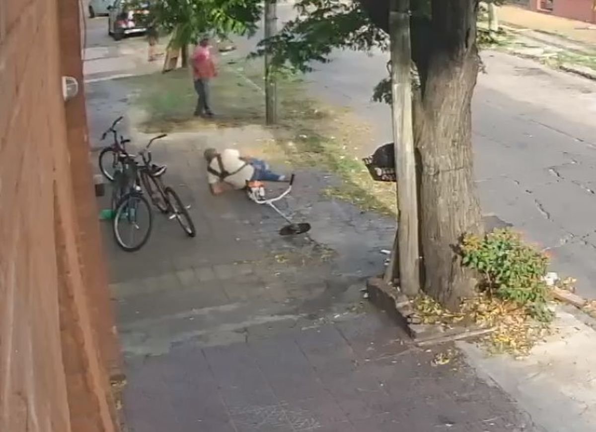 Las imágenes muestran como el señor de 38 años cortaba el pasto en la vereda tranquilamente cuando de repente ve pasar una Toyota Hilux de color blanca en dirección a la Diagonal República, la cual era seguida a toda velocidad por un patrullero debido a que la misma había sido robada minutos antes en la ciudad de Villa Bosch.