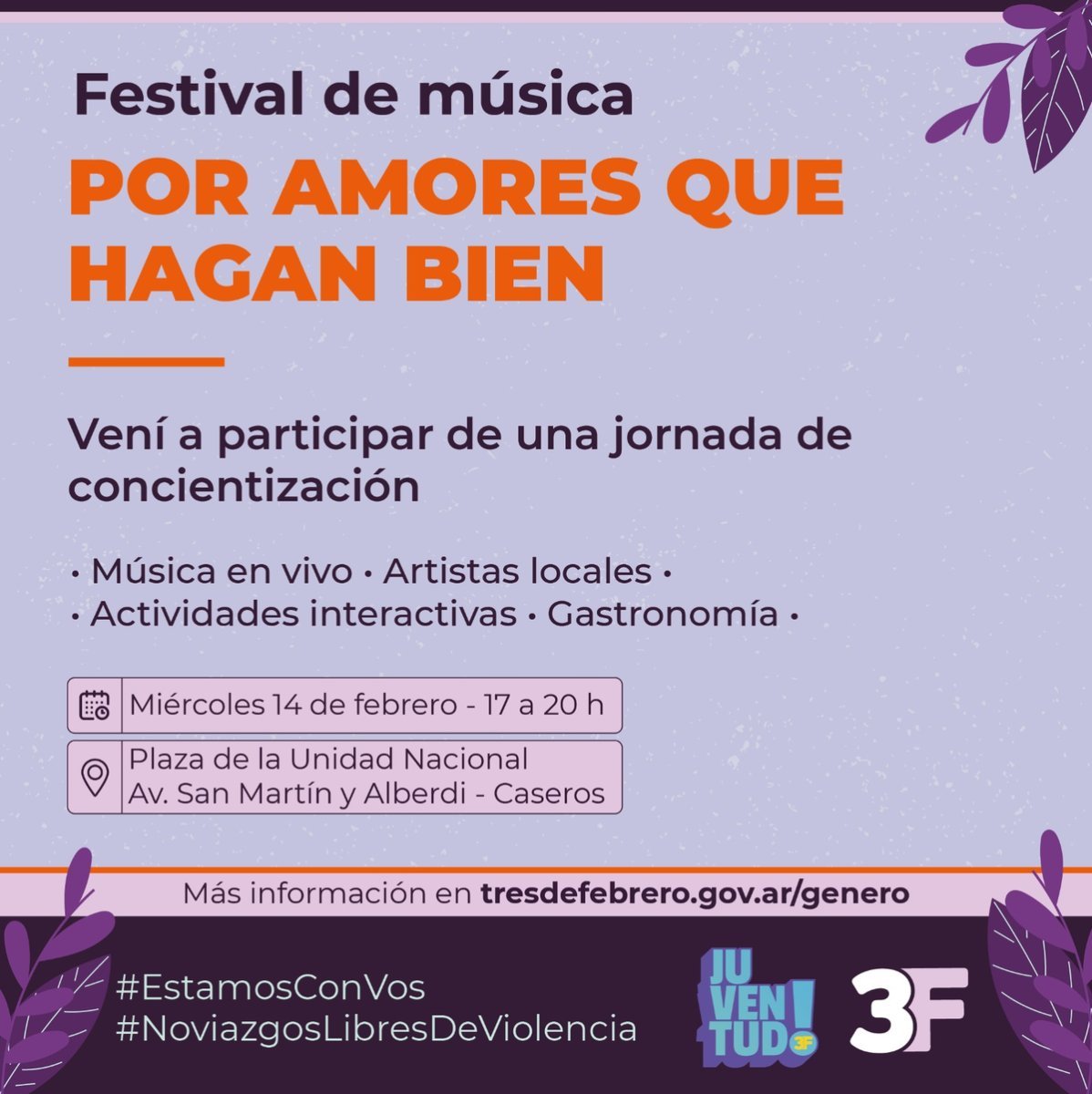 "En el mes de los enamorados, te invitamos a participar de 'Por amores que hagan bien', una jornada de concientización sobre la violencia de género que tendrá música en vivo, artistas locales, actividades interactivas y la más rica gastronomía", comunicó el Municipio de Tres de Febrero. "Durante las actividades, vas a poder despejar todas las dudas sobre los tratos que tenés que tener con tu pareja en el marco de 'Noviazgos libres de violencia'", agregó.