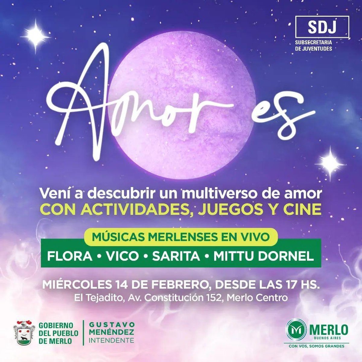 Por otra parte, la Subsecretaría de Juventudes del Municipio de Merlo llevará adelante una jornada "Amor es..." con diferentes actividades gratuitas y abiertas a la comunidad, como juegos, cine, artistas musicales en vivo y más. Durante la jornada se presentarán Flora, Vico, Sarita, y Mittu Dornel. La cita será este miércoles 14 de febrero a partir de las 17 horas, en El Tejadito ubicado en Av. Constitución 152 (Merlo).
