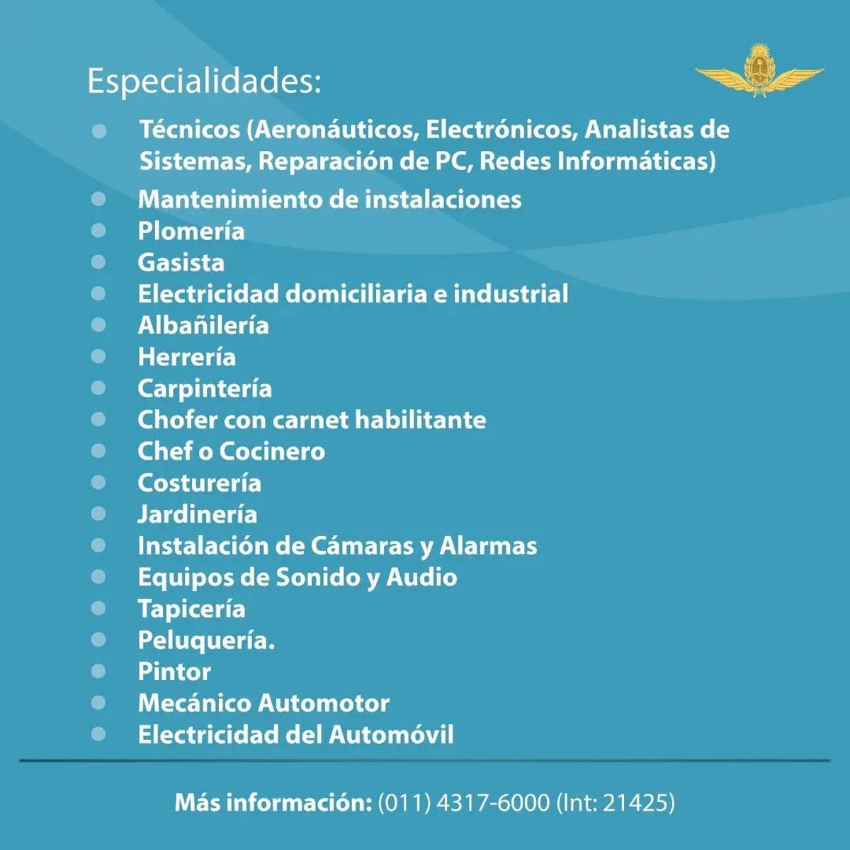 Cualquier información adicional puede ser consultada llamando al número de teléfono 4317-6000 y marcando el interno 21425.