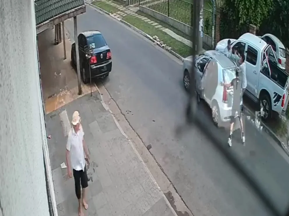 Las imágenes muestran como la víctima se estaba bajando de su Volkswagen Amarok de color blanco para dirigirse al bazar "Liró Regalos" que se encuentra en frente, pero justo en ese momento se le apareció una banda de media decena delincuentes fuertemente armados que circulaba en un Fiat gris plata.