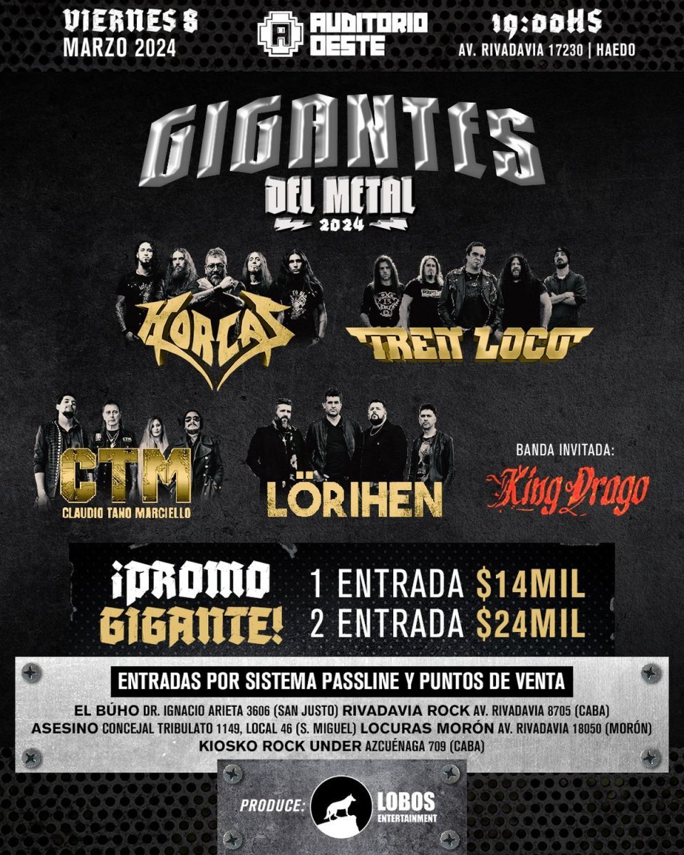 La segunda edición de "Gigantes del Metal", producido por Lobos Music Entertainment, llegará por primera vez al oeste, el viernes 08 de marzo, a partir de las 19 horas, y tendrá lugar en el escenario mayor del Auditorio Oeste ubicado en la Avenida Rivadavia 17320, en la localidad bonaerense de Haedo, partido de Morón.