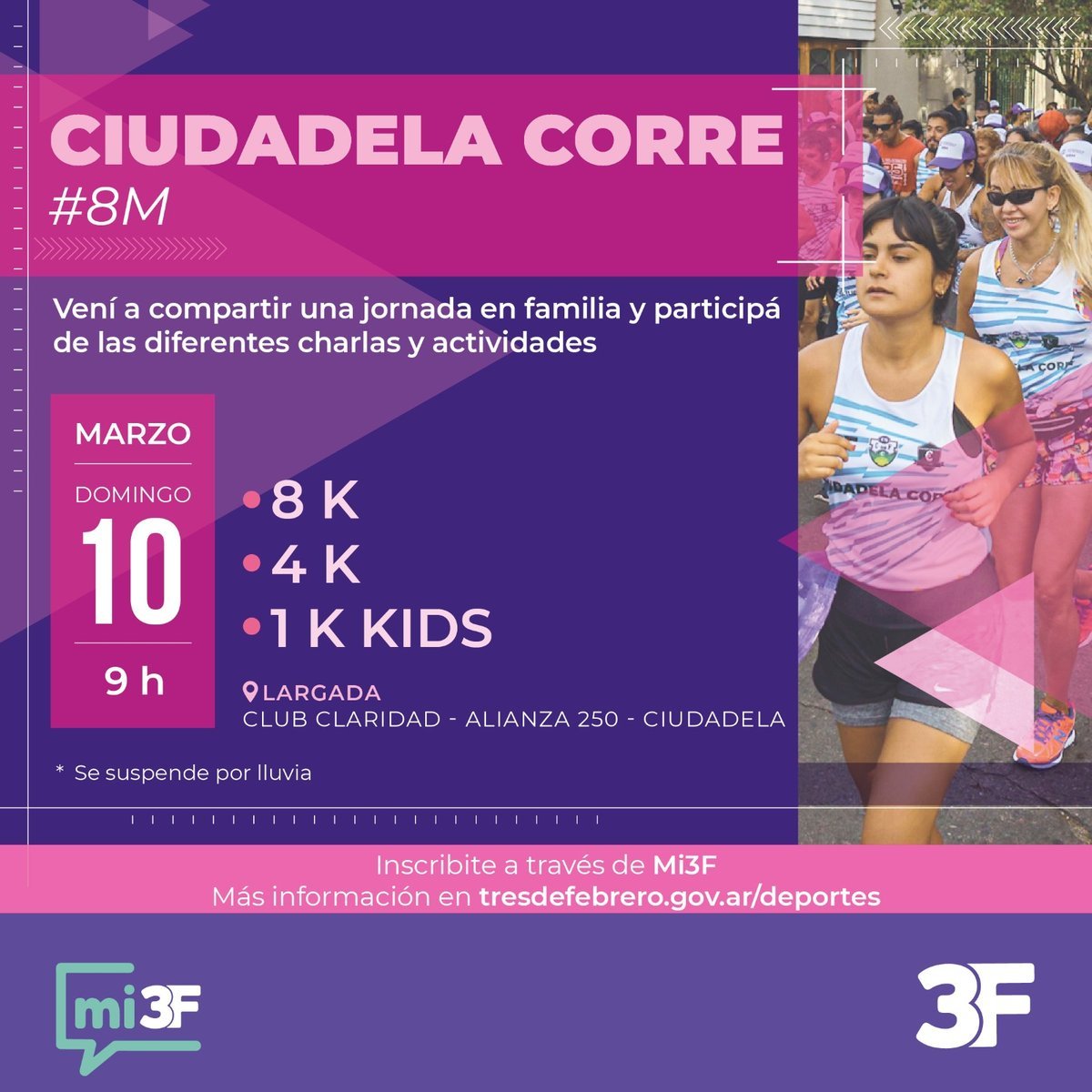 Por otra parte, quienes lo deseen podrán competir en la primera carrera del 2024 que, en esta oportunidad, se hará en el Club Claridad de Ciudadela (Alianza 250) el domingo 10 de marzo. El evento comienza a las 9 horas y los interesados pueden inscribirse mediante la plataforma Mi 3F. Tené en cuenta que se suspende por lluvia y, en tal caso, se reprograma para el domingo 17.