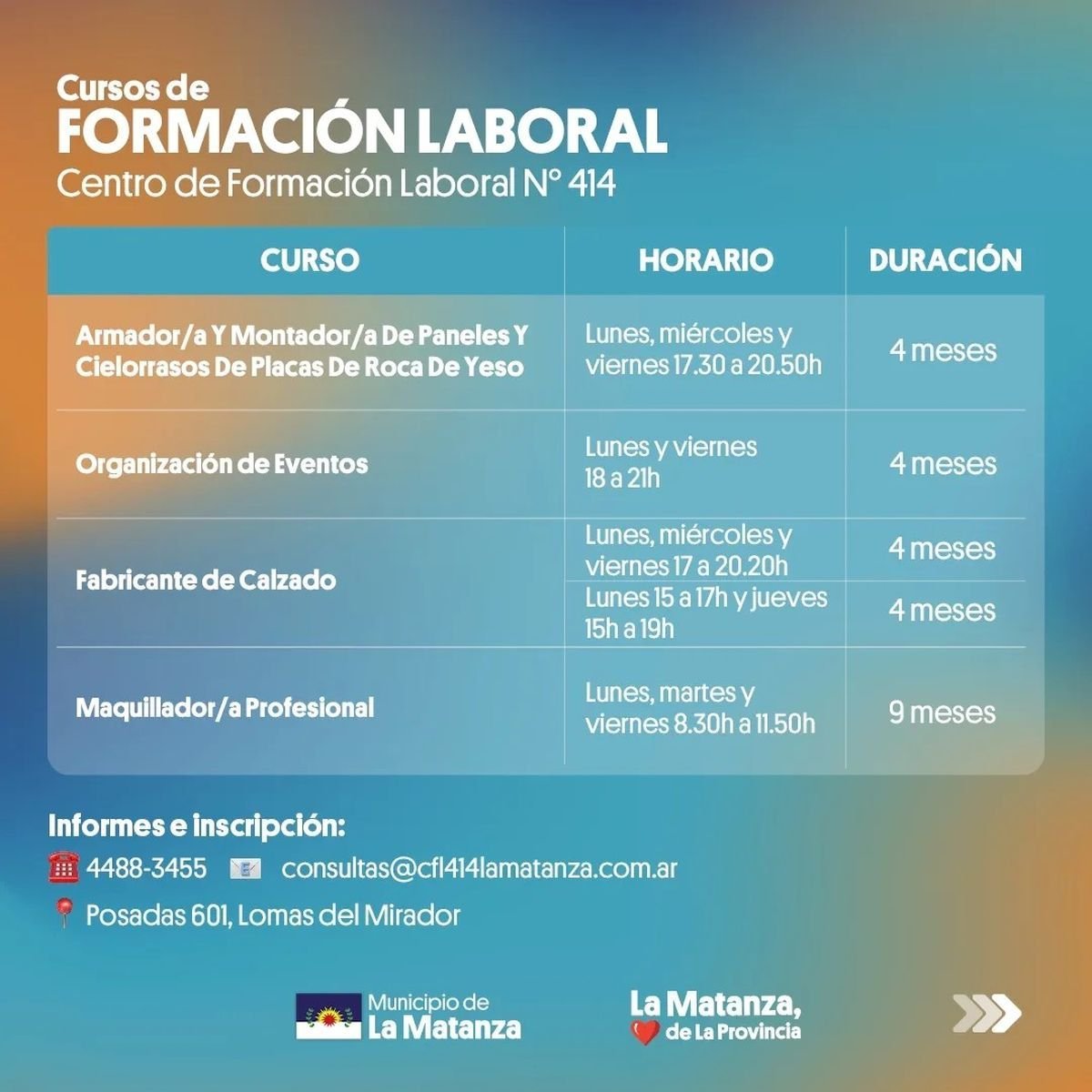 Cabe señalar que los cupos son limitados y que el Centro de Formación Laboral N°414 está ubicado en Posadas 601, Lomas del Mirador. Los interesados en sumarse a las capacitaciones deben comunicarse al 113230-3629 o bien al mail [email protected].