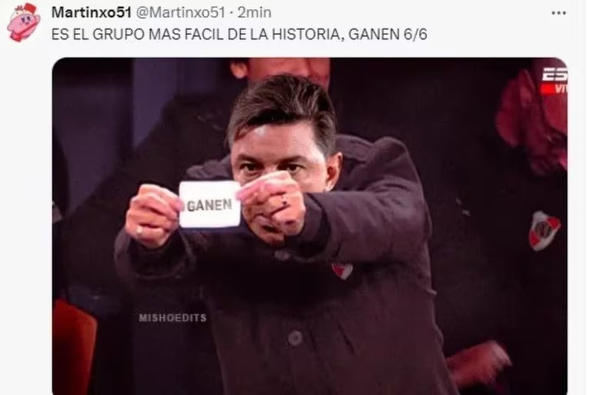 Además, la aparente facilidad del grupo de River, que incluye a Libertad (Paraguay), Deportivo Táchira (Venezuela) y Nacional (Uruguay), dio motivo para celebrar entre los hinchas del Millonario. En redes sociales, rápidamente aparecieron memes que hacían eco justamente de esta situación. Ahora, habrá que esperar para saber si realmente el "Millonario" la tiene sencilla o no.