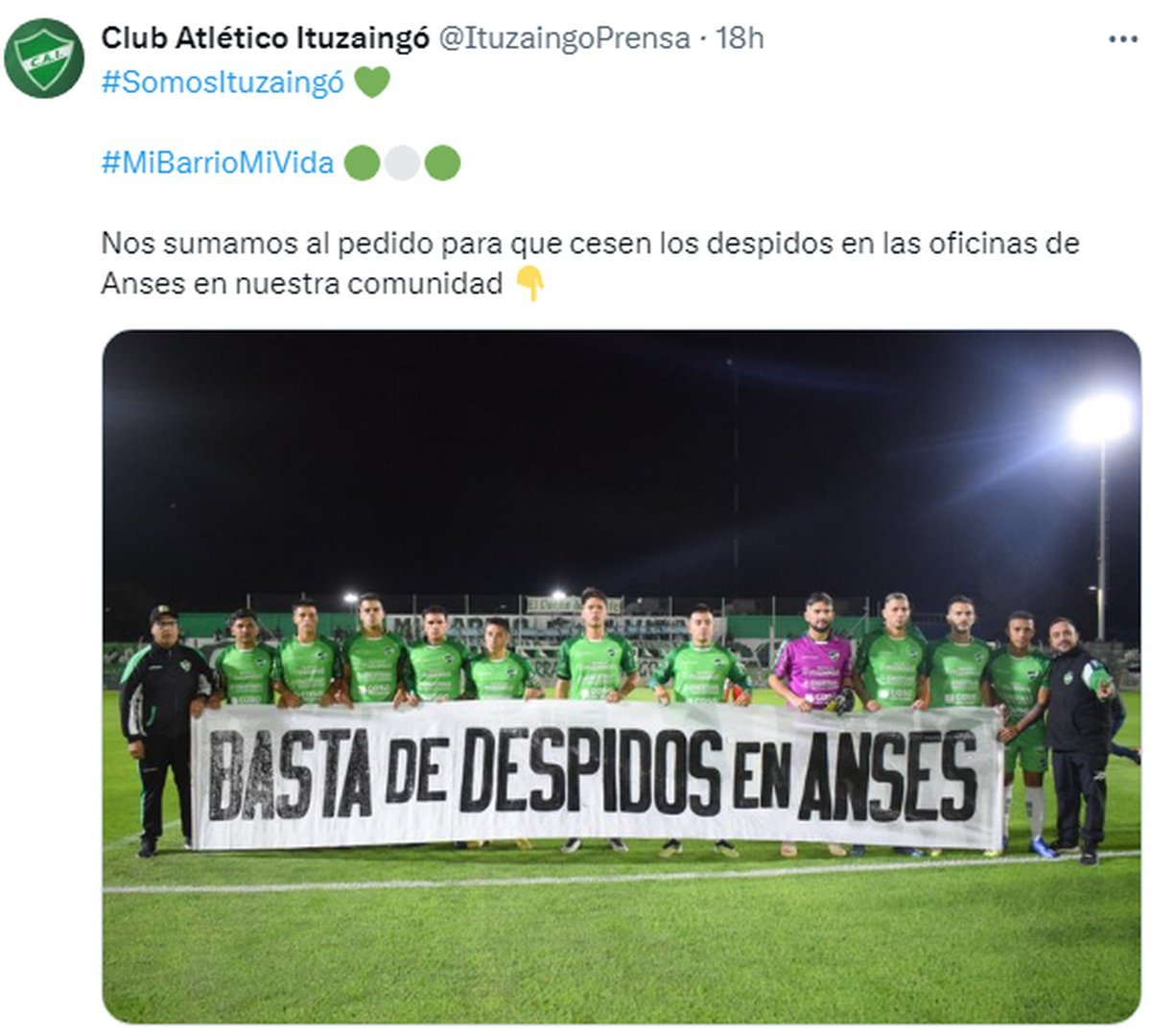 Esta imagen fue acompañada en las redes sociales de la entidad con la siguiente frase: "Nos sumamos al pedido para que cesen las desvinculaciones en las oficinas de nuestra comunidad", además de los tradicionales slogans "Somos Ituzaingó" y "Mi barrio, mi vida".