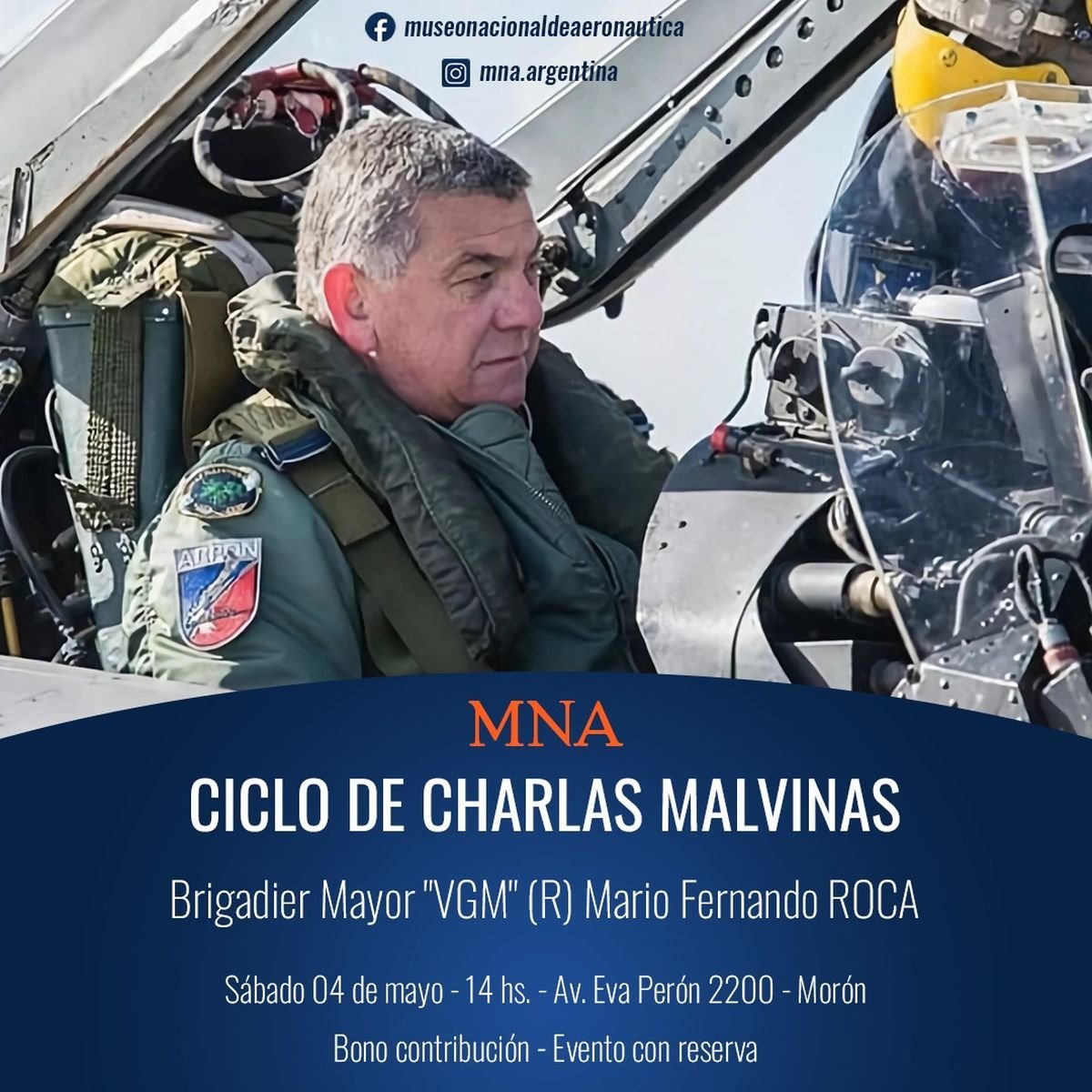 El brigadier mayor VGM (R) Mario "Arpón" Roca, fue piloto de caza de la Fuerza Aérea Argentina y voló el sistema de armas A4-B en el Conflicto del Atlántico Sur. "En una distendida charla, hablará sobre su accionar, sus vivencias y anécdotas", anunciaron desde el Museo Nacional de Aeronáutica.