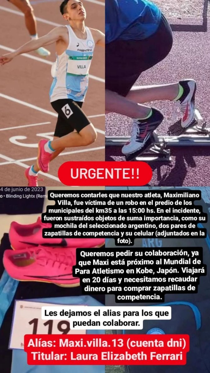 Más allá de salir ileso del asalto, lo que más afectó al atleta es que dentro de lo que le quitaron estaban los dos pares de zapatillas con clavos que usa para correr y que son de vital importancia ya que, dentro de apenas 20 días, debe viajar a la ciudad de Kobe, en Japón, para volver a representar a la República Argentina en el Mundial de Paraatletismo.