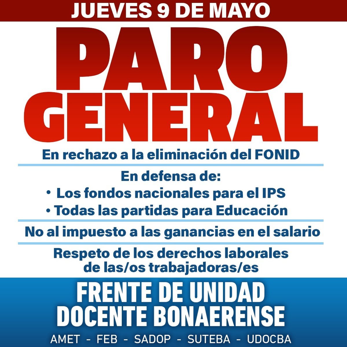 Entérate cuáles son los sindicatos de trabajadores de la educación pública y privada que se suman al paro nacional del 9 de mayo. Colectivos, trenes y subtes se suman al paro general: cómo funcionarán los servicios Paro general: las líneas de colectivos que funcionarán en el AMBA Cuándo serán los últimos servicios del Tren Sarmiento antes del paro general