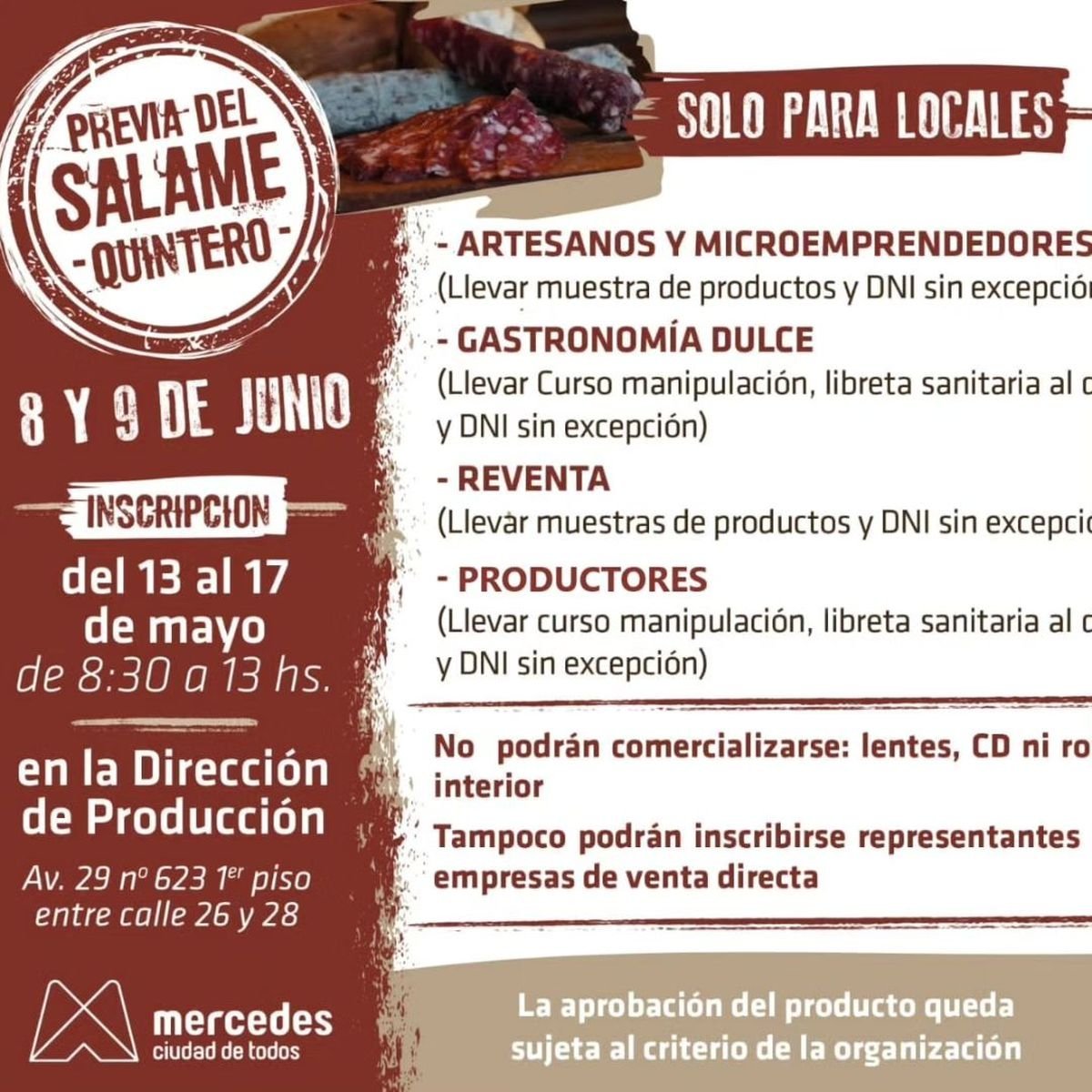 Por otro lado, desde el Municipio de Mercedes explicaron que los emprendimientos que deseen participar del evento pueden realizar su inscripción del 13 al 17 de mayo de 8:30 a 13:00 horas en la Dirección de Producción ubicado en Av. 29 N° 623 1° piso entre calle 26 y 28. A continuación, los detalles: