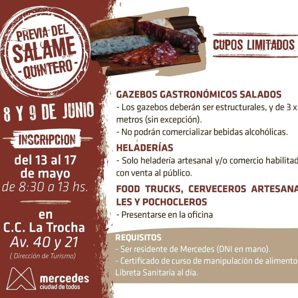 Es importante explicar que se deben cumplir con los siguientes requisitos: ser residente de Mercedes y presentar el certificado de curso de manipulación de alimentos Libreta Sanitaria al día.