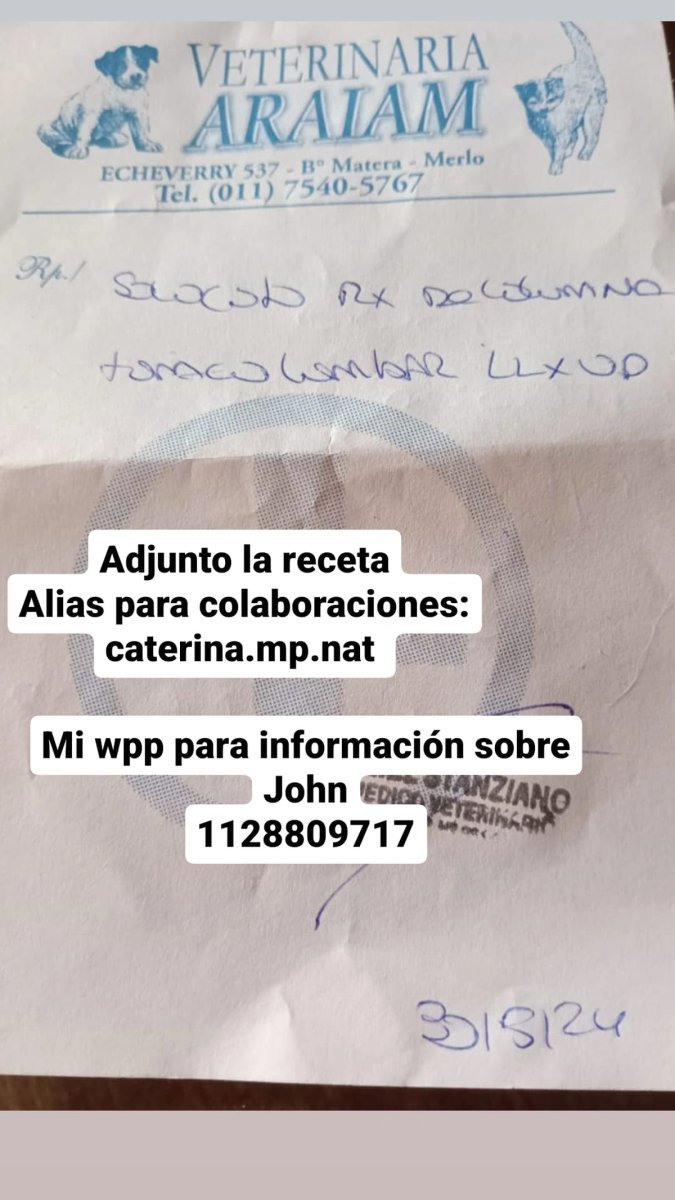 Un tiempo después, el canino quedó en manos de Caterina, quien decidió nombrarlo John y darle un hogar junto a sus otros pares. Sin embargo, ahora ella pide una pequeña ayuda para poder seguir con su tratamiento, ya que se tiene que someter a dos radiografías para conocer el estado de sus patas traseras: "El alias para colaborar es caterina.mp.nat. Desde ya, muchas gracias".
