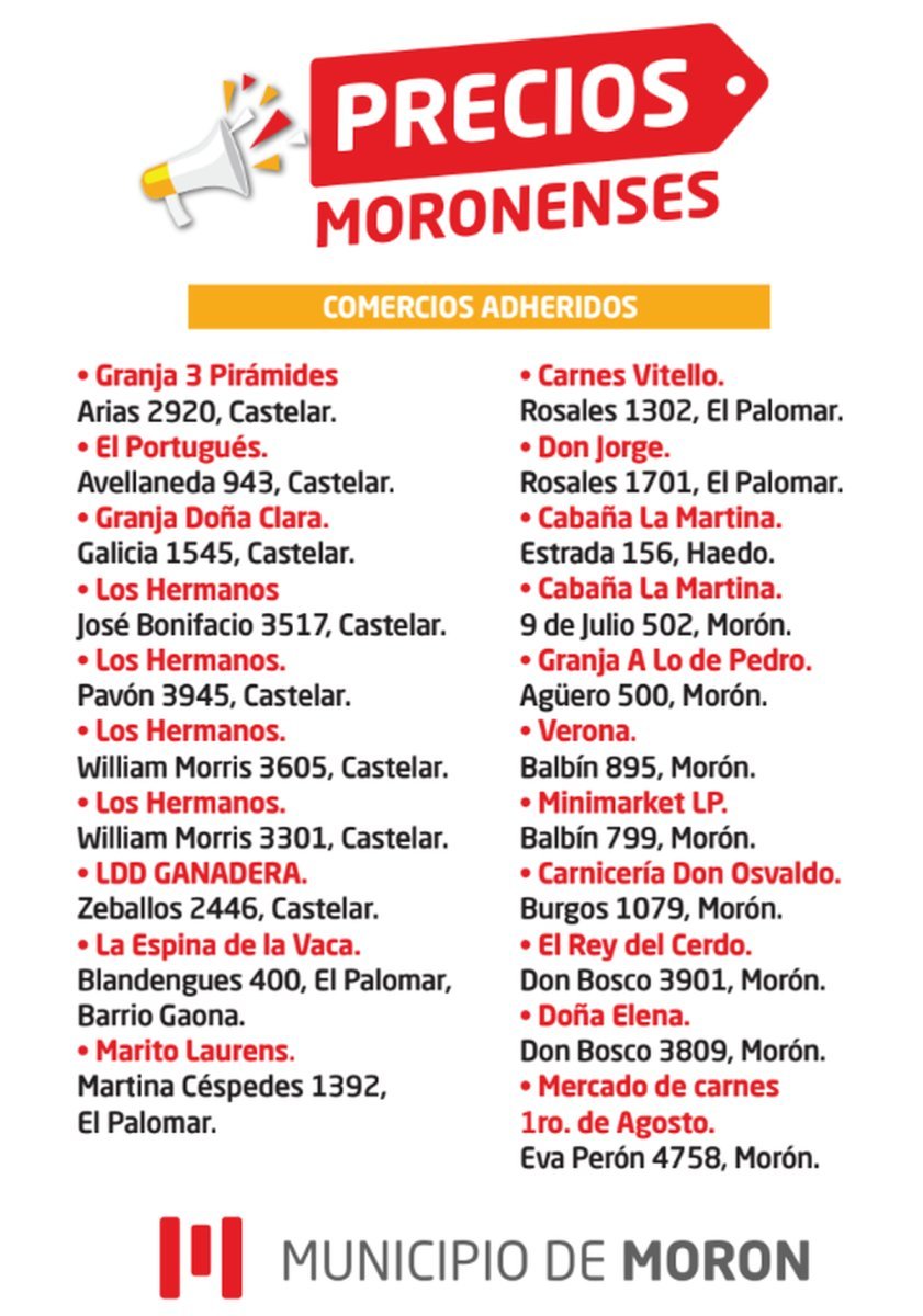 En marzo de 2024, el Municipio de Morón lanzó el programa "Precios moronenses" el que continúa vigente al día de hoy y que, en las últimas horas, sumó un 10% de descuento en carnicerías y granjas del partido para los días miércoles y jueves.