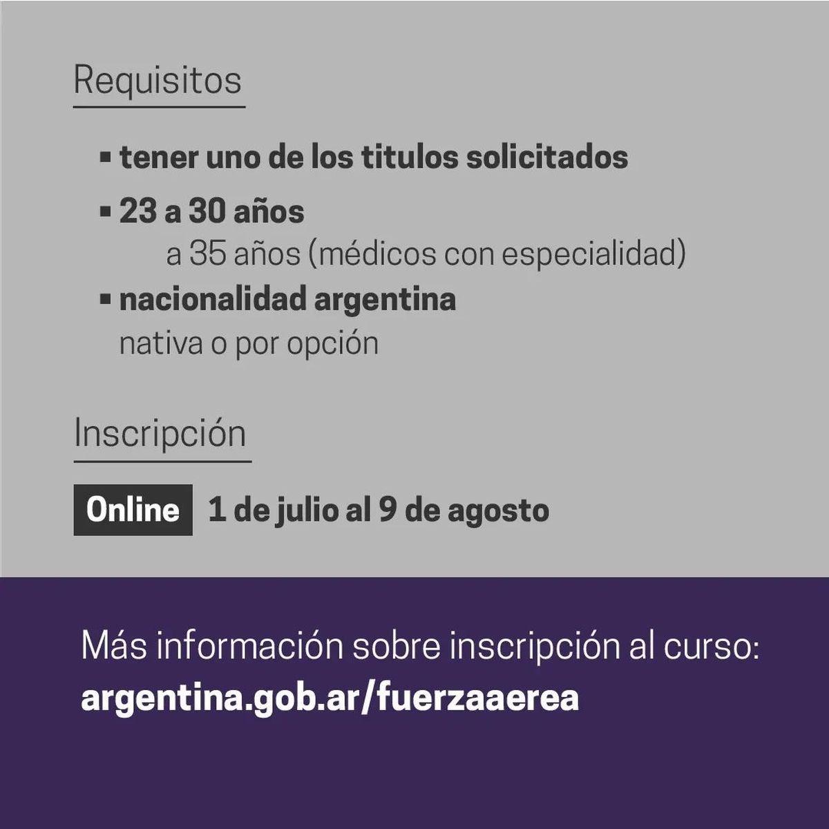 Es importante señalar que el curso se dictará en la Escuela de Aviación Militar ubicada en Córdoba, y que consta de instrucción física, militar y académica para el desempeño del profesional en la institución. Derecho humanitario, reglamento militar, armamento y supervivencia son algunas de las disciplinas abordadas.