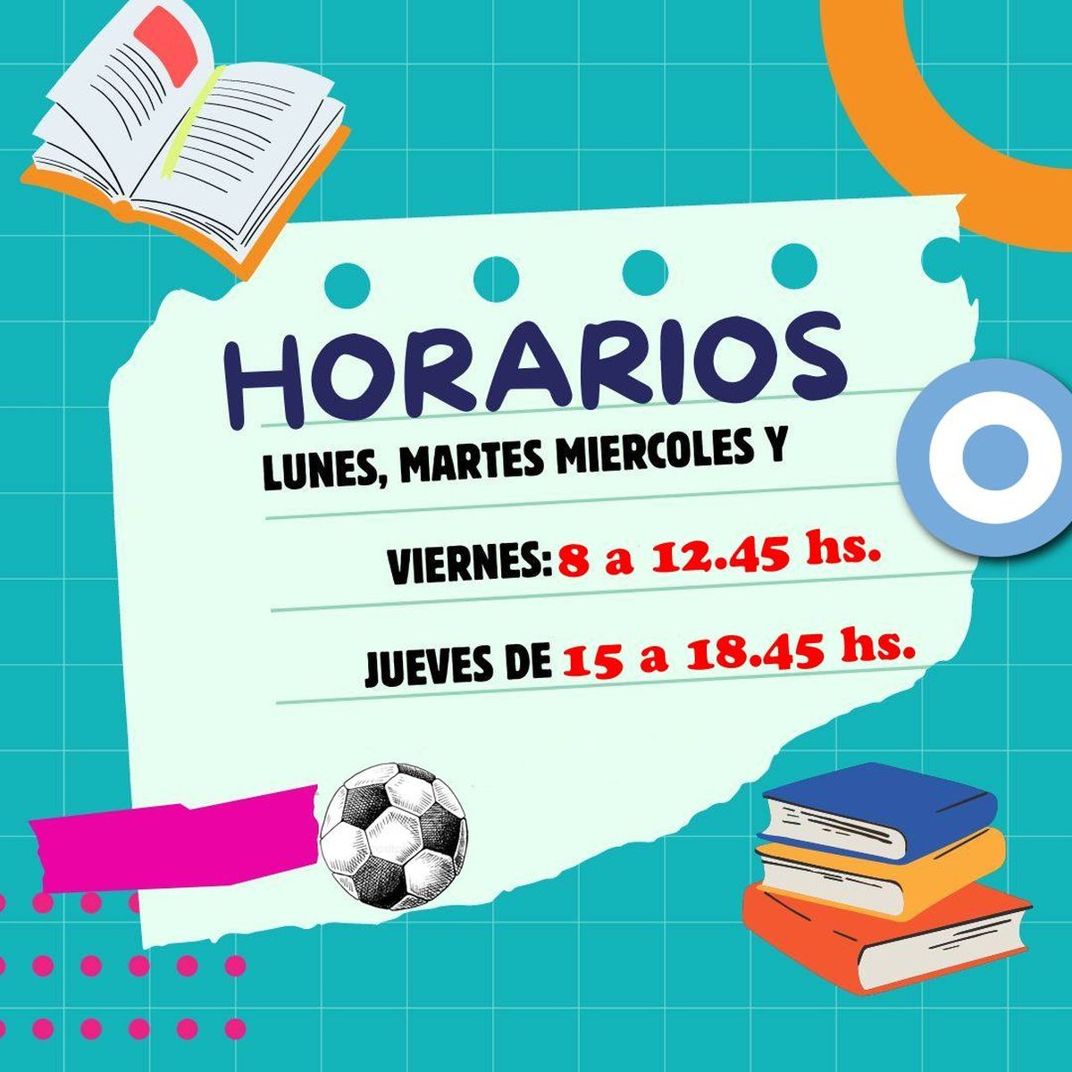 Turno Mañana: lunes, martes, miércoles y viernes de 08:00 a 12:45 horas. Turno Tarde: jueves de 15:00 a 18:45 horas.