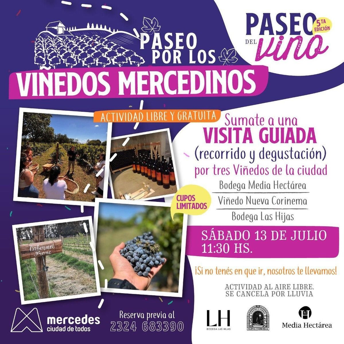 En cuanto al paseo por los viñedos de Mercedes, se realizará el sábado 13 de julio a las 11:30 horas, está actividad es libre y gratuita con reserva previa al 2324-683390. En el paseo de visitará la Bodega Media Hectárea, Viñedo Nueva Corinema y Bodega Las Hijas.