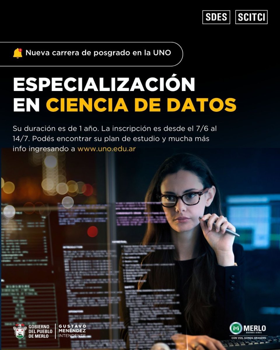 Por otro lado, desde el espacio recordaron que la Universidad Nacional del Oeste continúan con las inscripciones abiertas hasta el 14 de julio para la Especialización en Ciencia de Datos que consiste en un programa de un año diseñado para "formar profesionales que conecten los fundamentos teóricos con el conocimiento práctico, fomentando la investigación y la aplicación rigurosa de metodologías de análisis en un entorno interdisciplinario".