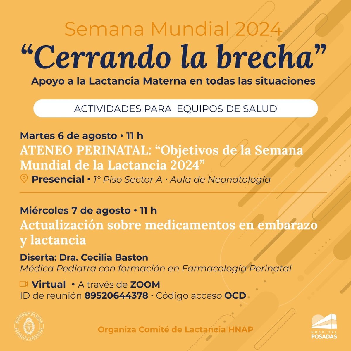- El martes 6 de agosto, a las 11 horas, en el Aula de Neonatología - 1er piso sector A: Ateneo perinatal: "Objetivos de la Semana Mundial de la Lactancia 2024"