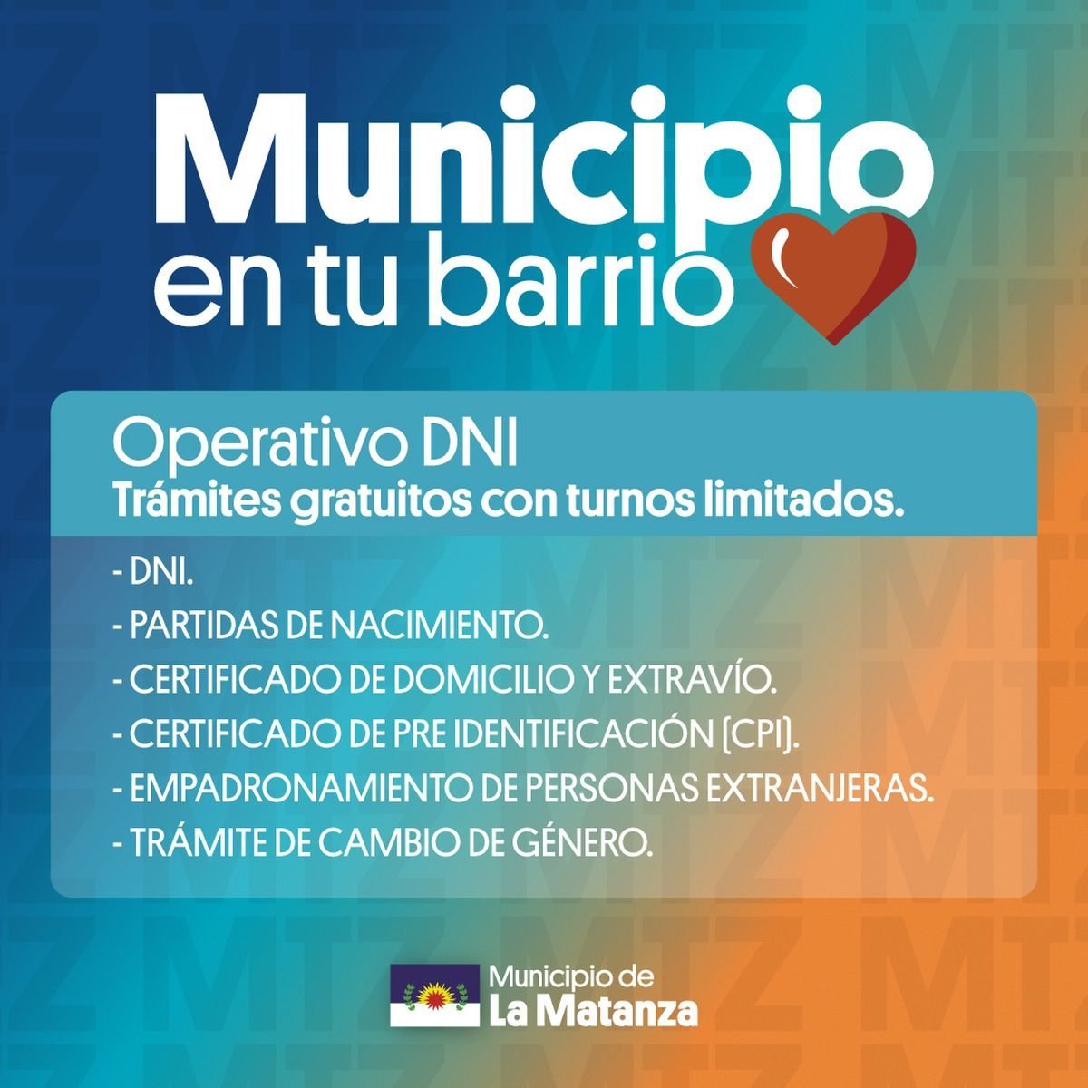 El operativo "el Municipio en tu barrio" llega esta semana a Virrey del Pino para que los vecinos de La Matanza puedan acceder a diferentes trámites.
