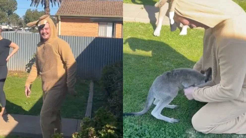 Todo sucedió en el jardín de una casa en Australia, donde los propietarios se encontraron con una sorprendente visita. Un canguro bebé, visiblemente perdido, apareció en su patio. Uno de los residentes, al notar el estado del asustado marsupial, decidió intentar algo fuera de lo común: buscó un viejo disfraz de canguro que tenía guardado en su armario. Todo quedó registrado en video y se volvió viral en las plataformas del cibermundo.