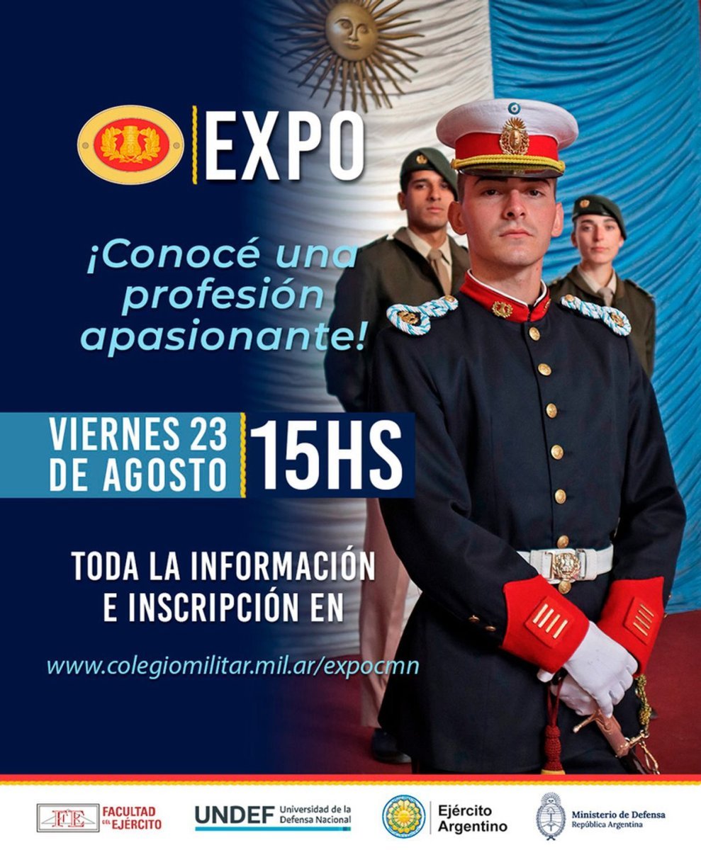 "¿Sos estudiante, estás terminando el secundario y buscas una profesión única y apasionante? Vení a conocernos", expresaron desde el Colegio Militar y explicaron que la expo será este viernes 23 de agosto a las 15:00 horas en el espacio ubicado en Aviador Matienzo y Ruta 201, El Palomar.