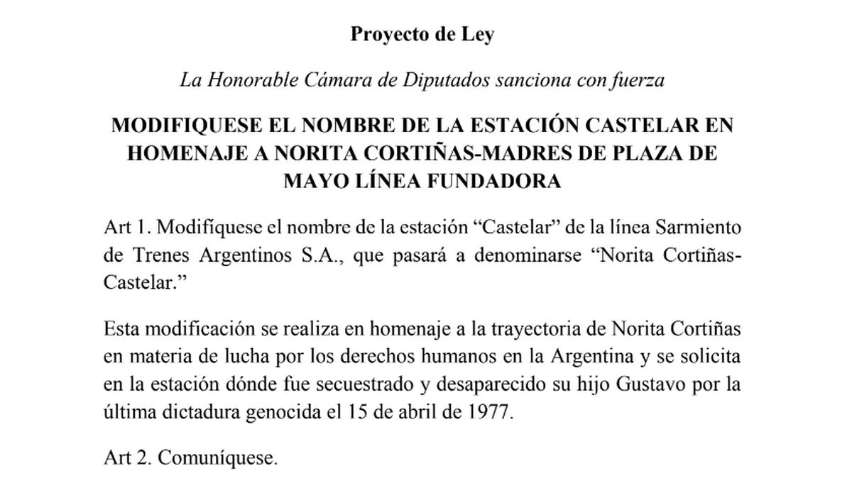 El argumento principal de la legisladora es que en la mencionada parada ferroviaria fue secuestrado y desaparecido el hijo de la activista y fundadora de la asociación civil Abuelas de Plaza de Mayo (que también es originaria e histórica vecina de la ciudad), Gustavo, por la última dictadura cívico-militar el 15 de abril de 1977.