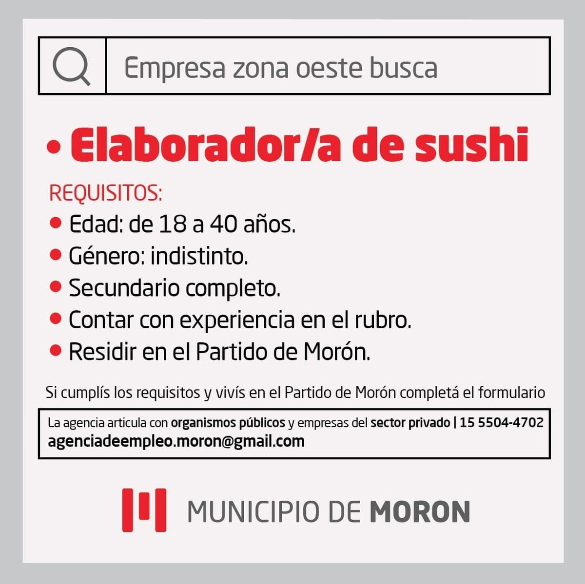- Requisitos: edad de 18 a 40 años; género indistinto; secundario completo; contar con experiencia en el rubro y vivir en el partido de Morón.
